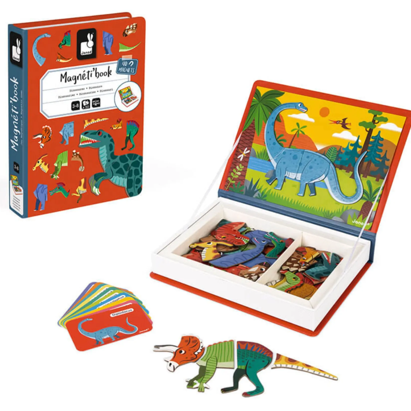 -This cardboard game takes children aged 3 and up into the world of dinosaurs with 40 magnets and 10 cards showing the dinosaur’s name in Latin.