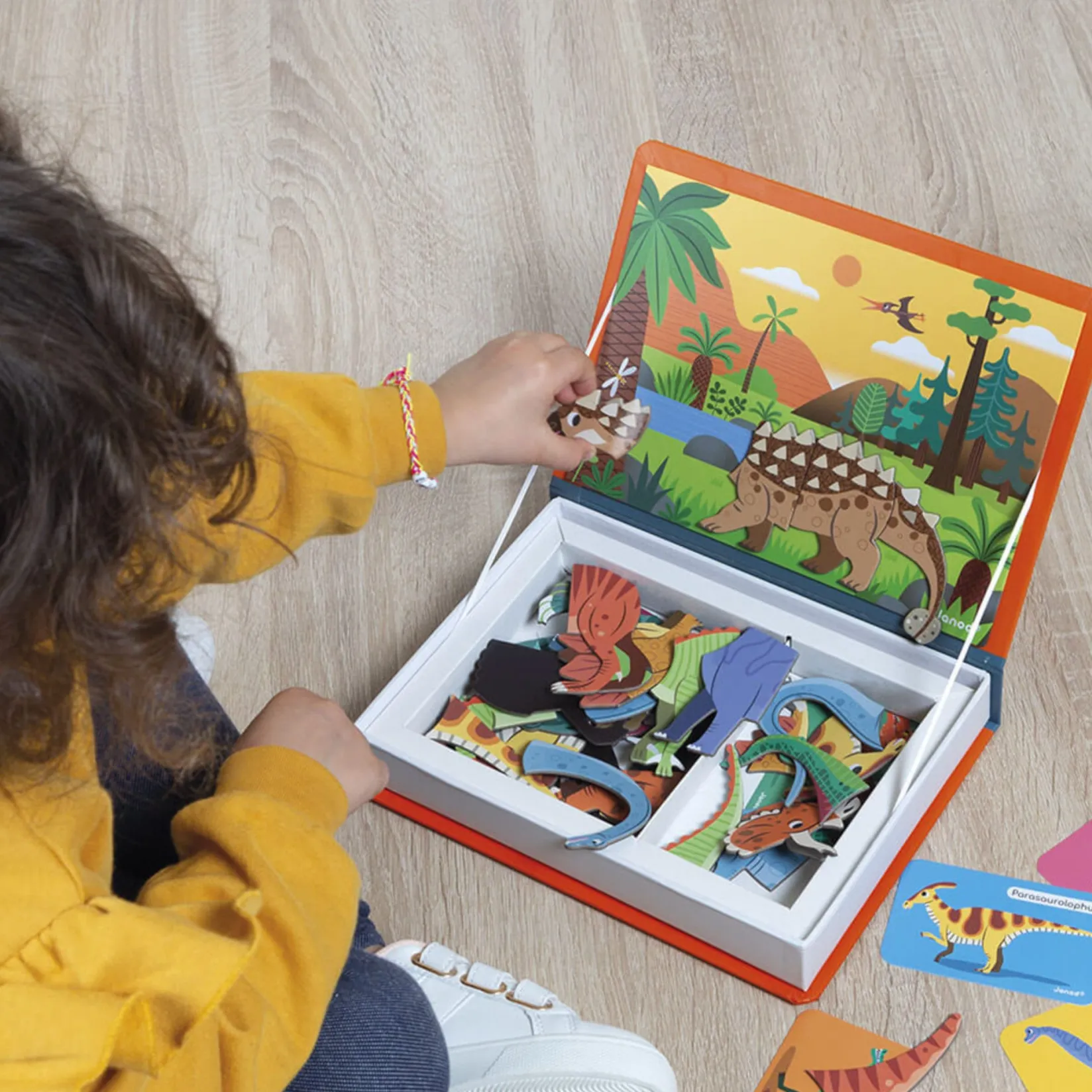 -Once the book is open, the goal is to recreate on the magnetic scene the dinosaur shown on the card using the magnets.