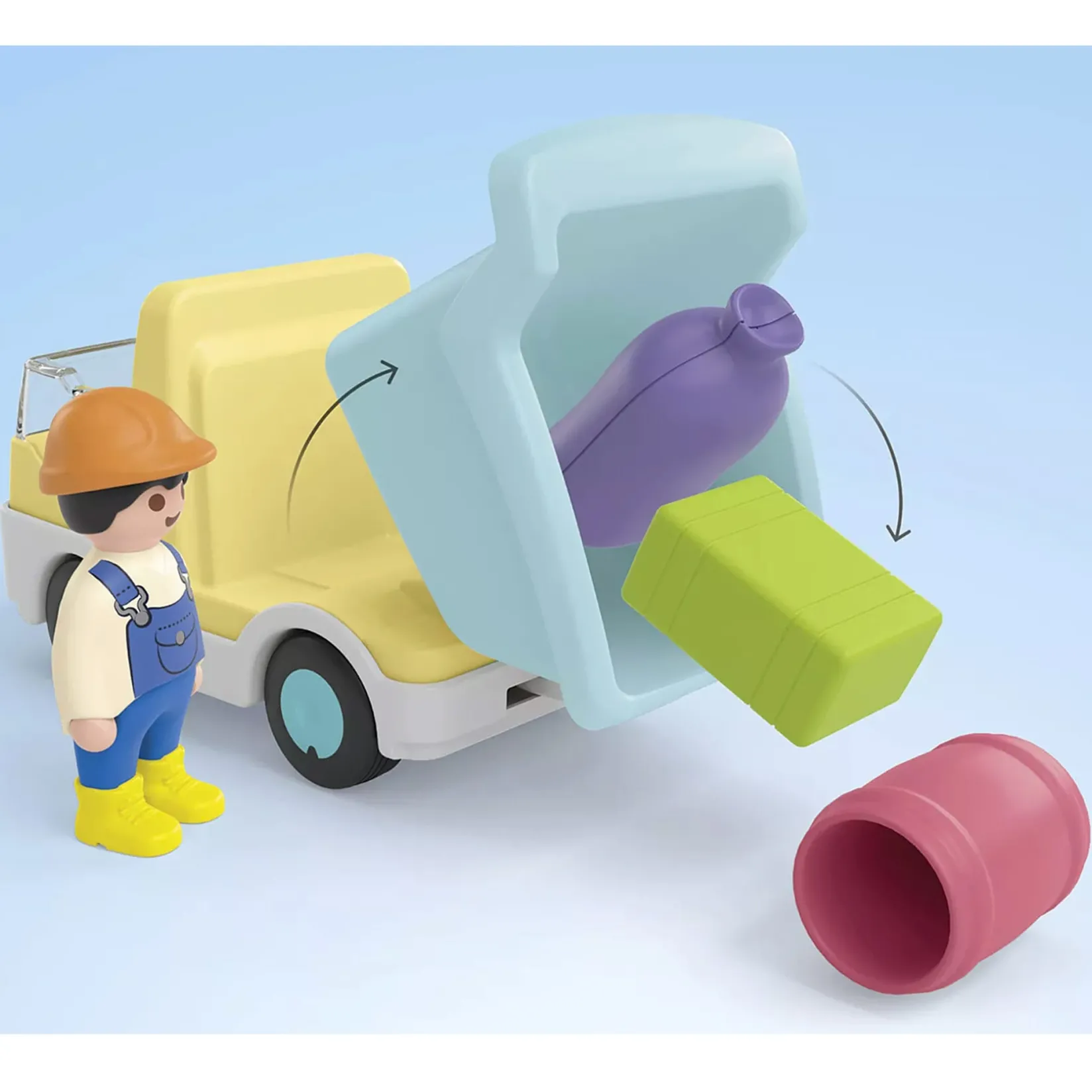 Give your little one a variety of experiences with this versatile toy! The construction worker takes his seat in the driver’s cab. When your child backs the truck into the garage, the bag, crate, and barrel find their place in the dump bed through the correct cutout. Which item will fall into the dump bed first?