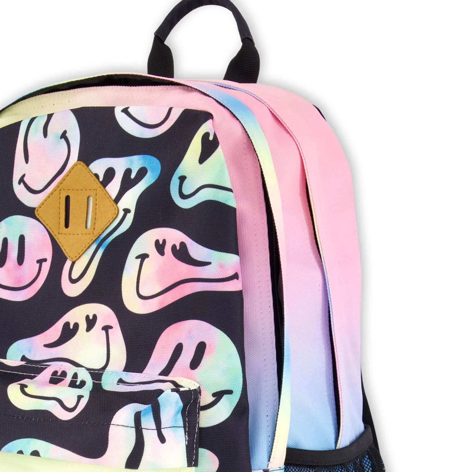 With two large compartments and an interior pocket for a tablet or a 15″ laptop, this black butterfly print school bag is sized to hold all of your essential school gear. In oxford fabric made from recycled plastic bottles, this eco-friendly backpack includes a convenient water bottle pocket, a front zipper pocket for small items, and a reinforced bottom for strength and durability.