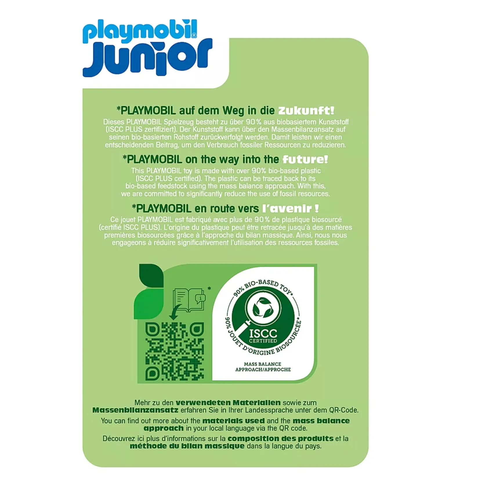 All PLAYMOBIL JUNIOR playsets are also made from more than 90% plant-based plastics, which can be traced to materials from food or paper production, using the mass balance approach in the circular economy. These plastics are as robust and easy to maintain as usual.
