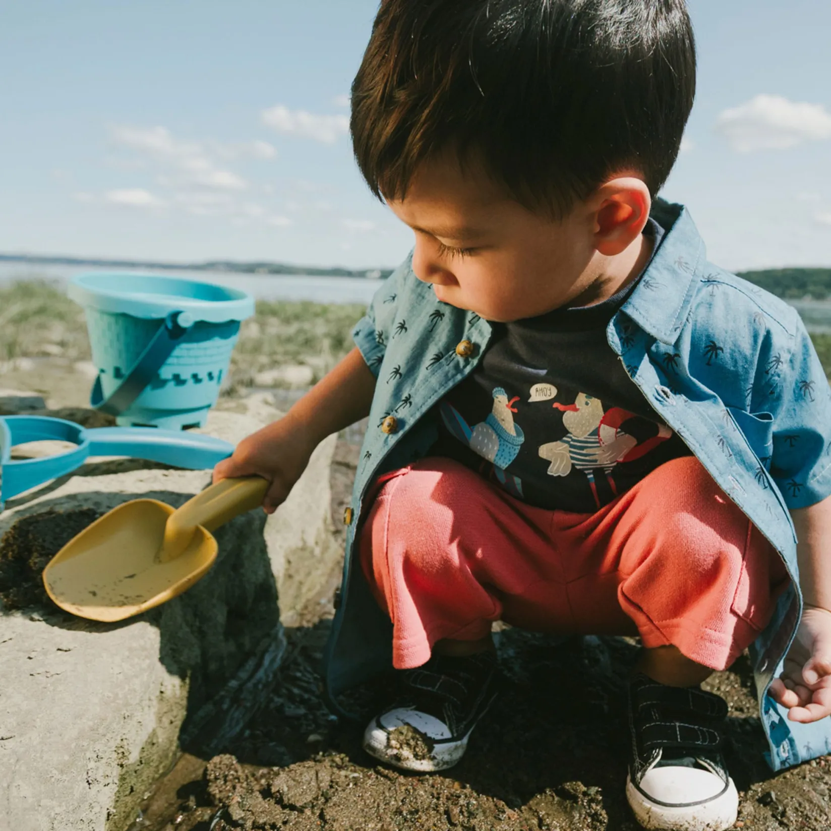 The organic cotton short sleeve t-shirt in blue is a comfy essential with a playful spirit. This classic tee features a round neckline, short sleeves, a fun seagull graphic print, and a simple design that makes it versatile for everyday adventures. Made from soft organic cotton with a touch of stretch, it pairs perfectly with the fun bottoms from the “Coastal Days” collection.