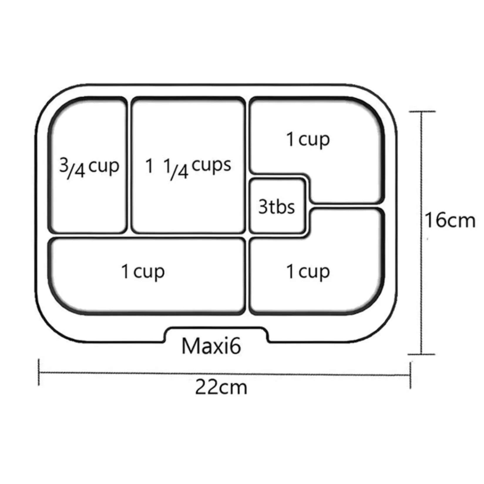 A removable internal tray features five portioned compartments specifically designed to hold appropriate servings of each of the five key food groups – dairy, grains, protein, fruits and vegetables – as well as a small sixth section for dips or a treat.