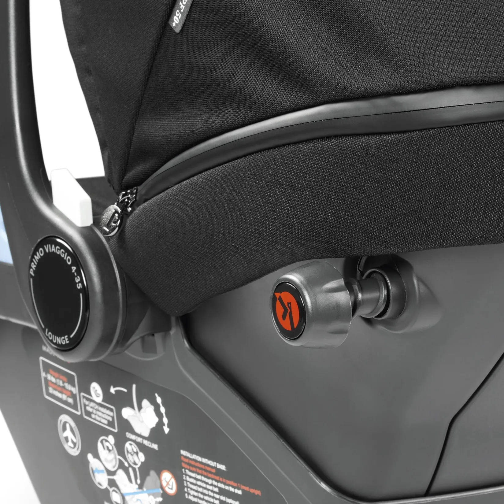 The Agio by Peg Perego Primo Viaggio 4-35 Lounge Infant Car Seat features the Comfort Recline function: the backrest reclines and the leg rest extends, allowing the child to lie down in the best ergonomic position when used on a stroller. The extendable Pagoda Hood provides full coverage, shielding baby from outside elements. The Load Leg Base and Anti-Rebound Bar reduce rotation in case of an accident, the new Kinetic Pods offer enhanced side impact protection: just a few of the innovative features with the Agio Baby Primo Viaggio 4-35 Lounge Infant Car Seat that help protect your newborn.
