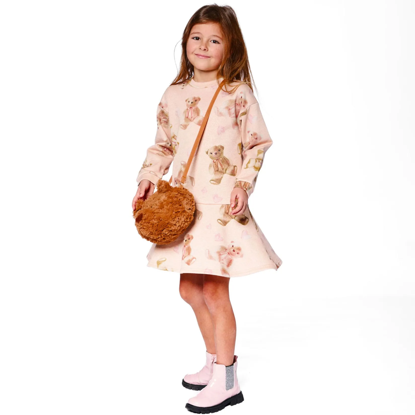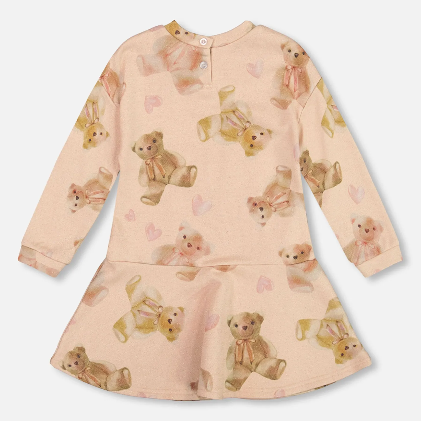Our French Terry Dress Beige Teddy Bear Print is a cozy and playful option for chilly days. This sweatshirt dress features an allover teddy bear and heart print on soft brushed terry, long sleeves, dropped shoulders, a round neckline and a drop-waist pleated skirt for extra twirl. It’s the perfect balance of fun and comfort for girls who love sweet details.