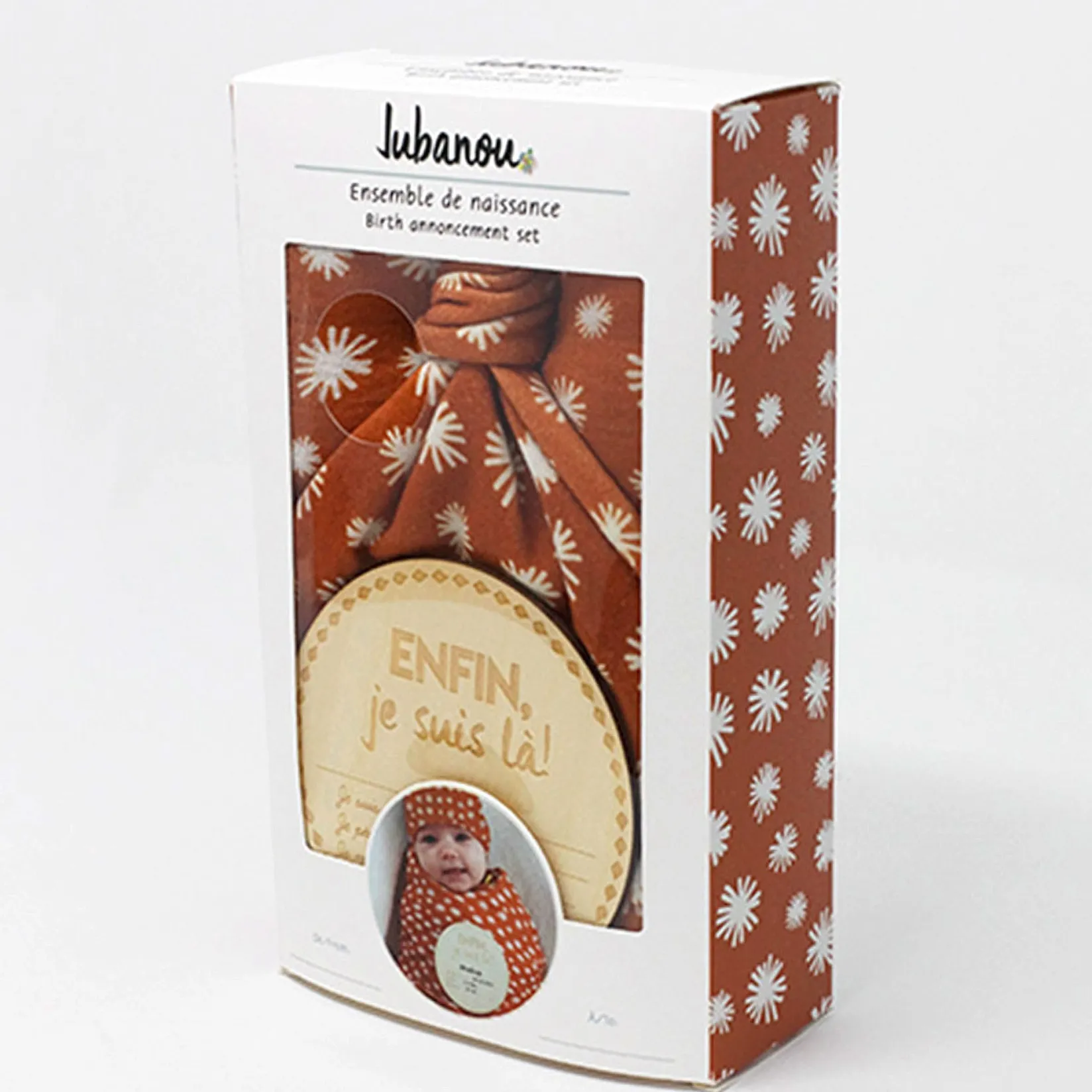 L’ensemble de naissance Flake comprend une mousseline de bambou, un bonnet et une pastille de bois « Enfin, je suis là ! » servant à identifier les informations de naissance telles que le nom, la date de naissance, le poids et les mesures à la naissance de votre nouveau-né. C’est l’ensemble parfait pour emmailloter votre bébé à son arrivée en plus de pouvoir noter ses informations de naissance. C’est aussi l’ensemble parfait pour prendre une photo de votre poupon à son premier jour de vie et pour en faire l’annonce officielle à vos proches.