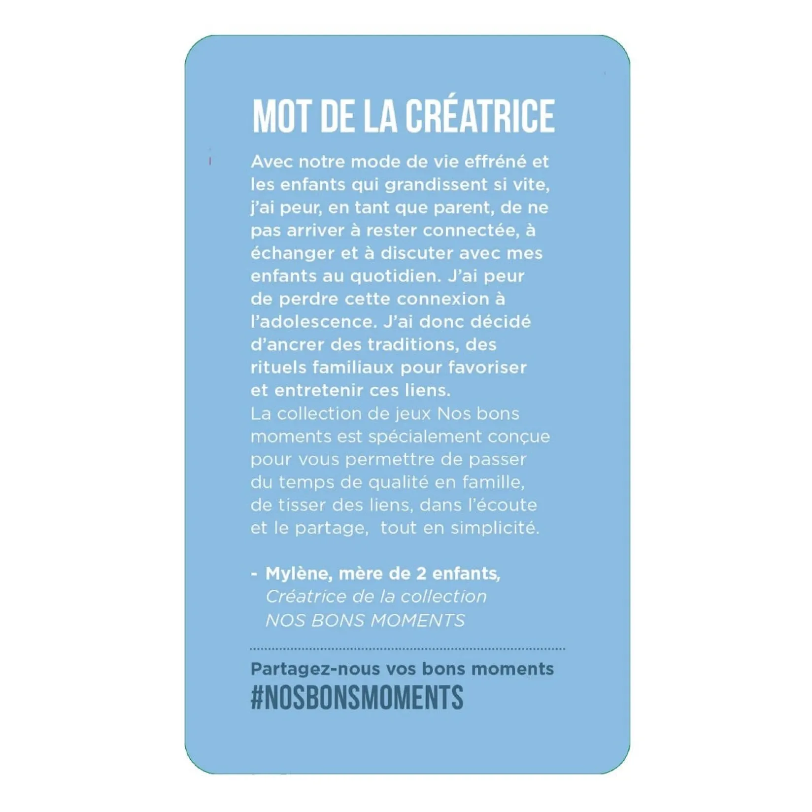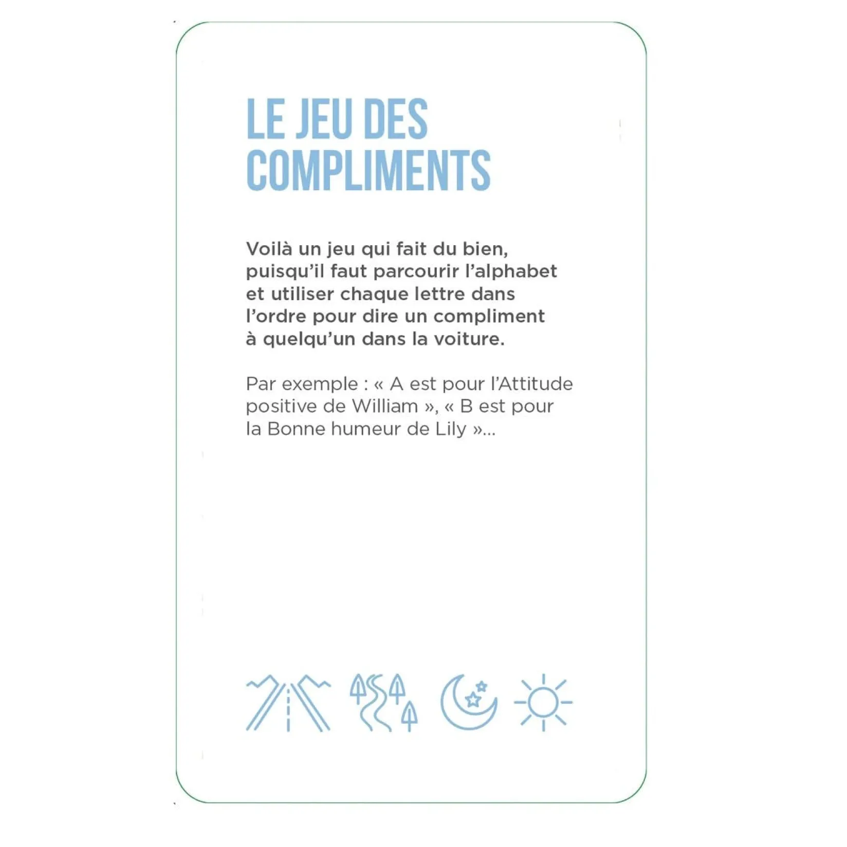 The «Nos Bons Moments-Sur la Route» game offers 48 simple and fun activities to reduce impatience and boredom during car trips. To do day, night, on the highway, in the countryside or in town! Purpose of the game: Draw a card that will determine the activity for the next few minutes / hours. It’s easy!