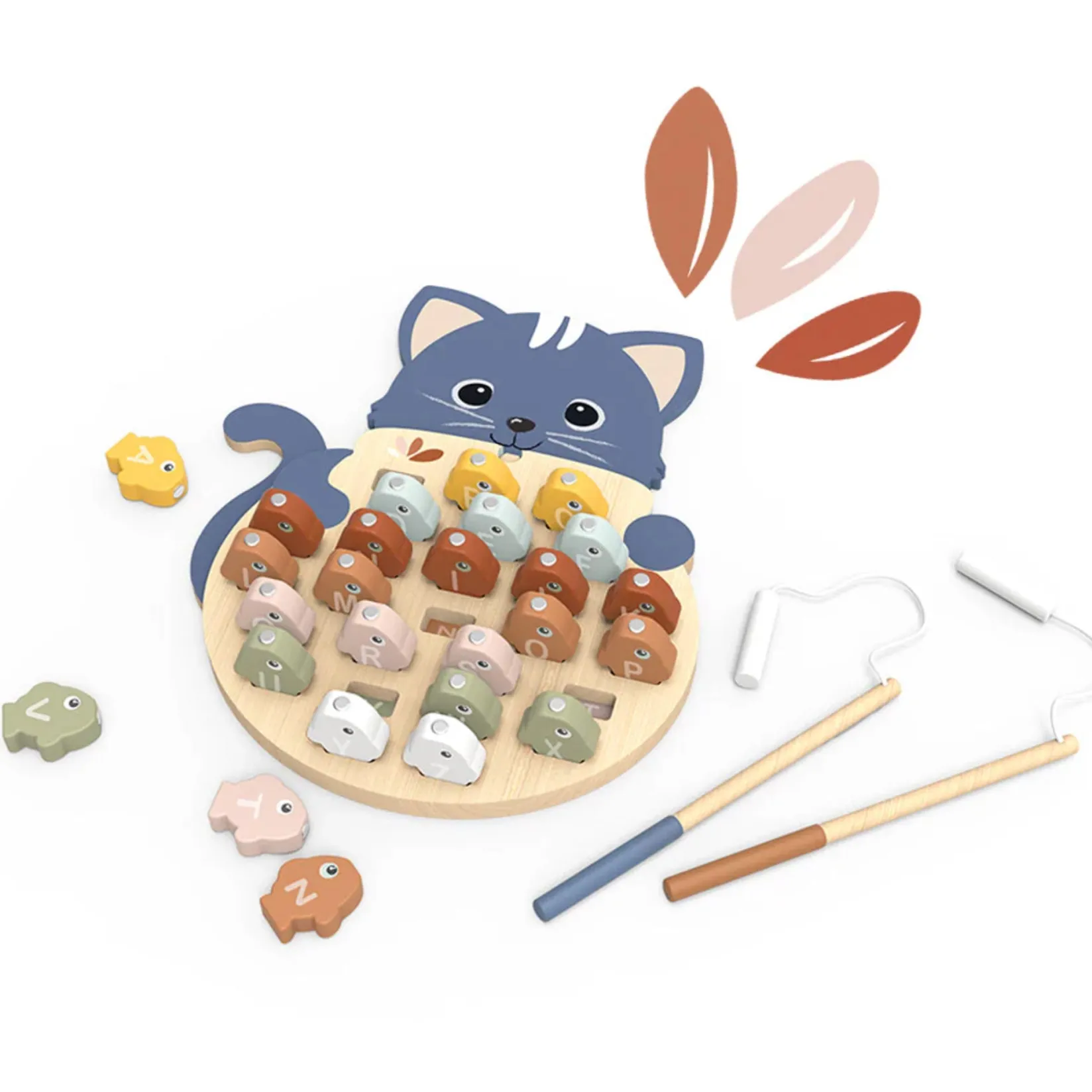 Each wooden fish features a brightly painted letter of the alphabet, helping children become familiar with letter shapes and sequencing in a playful, hands-on way. The magnetic fishing rods are easy to grip, encouraging hand-eye coordination and concentration.