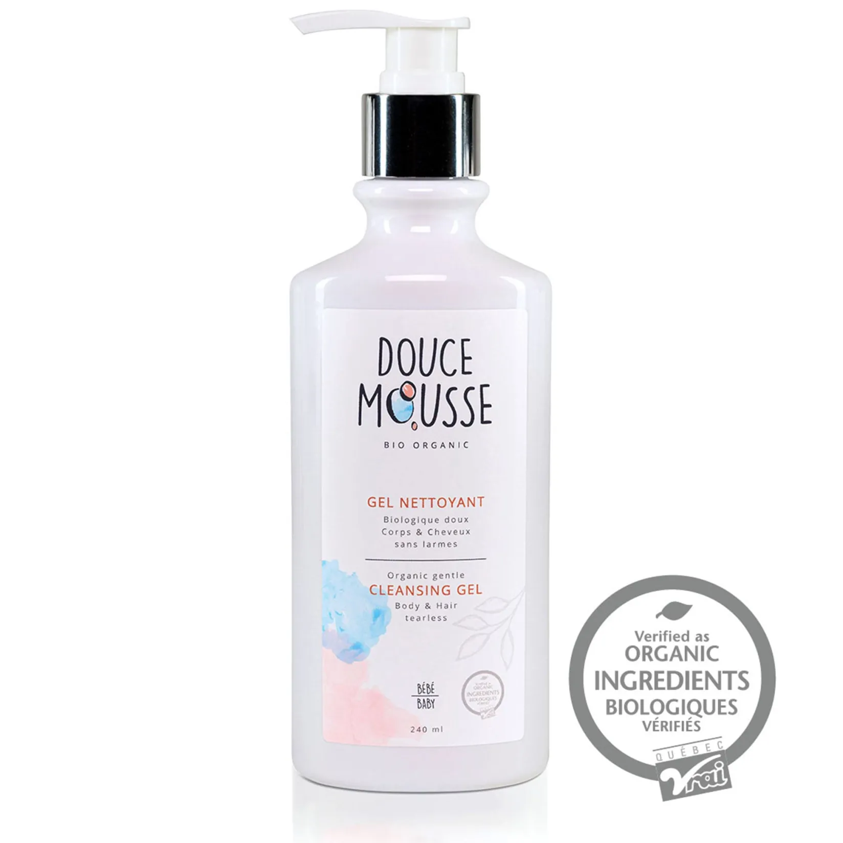 Our baby cleansing gel is made with an ultra-gentle plant-based base and ingredients certified organic by Québec Vrai. These certified ingredients ensure superior quality while respecting your baby’s delicate skin. Aloe, calendula, chamomile, and a delightful certified organic peach and apricot scent complete our formulation.