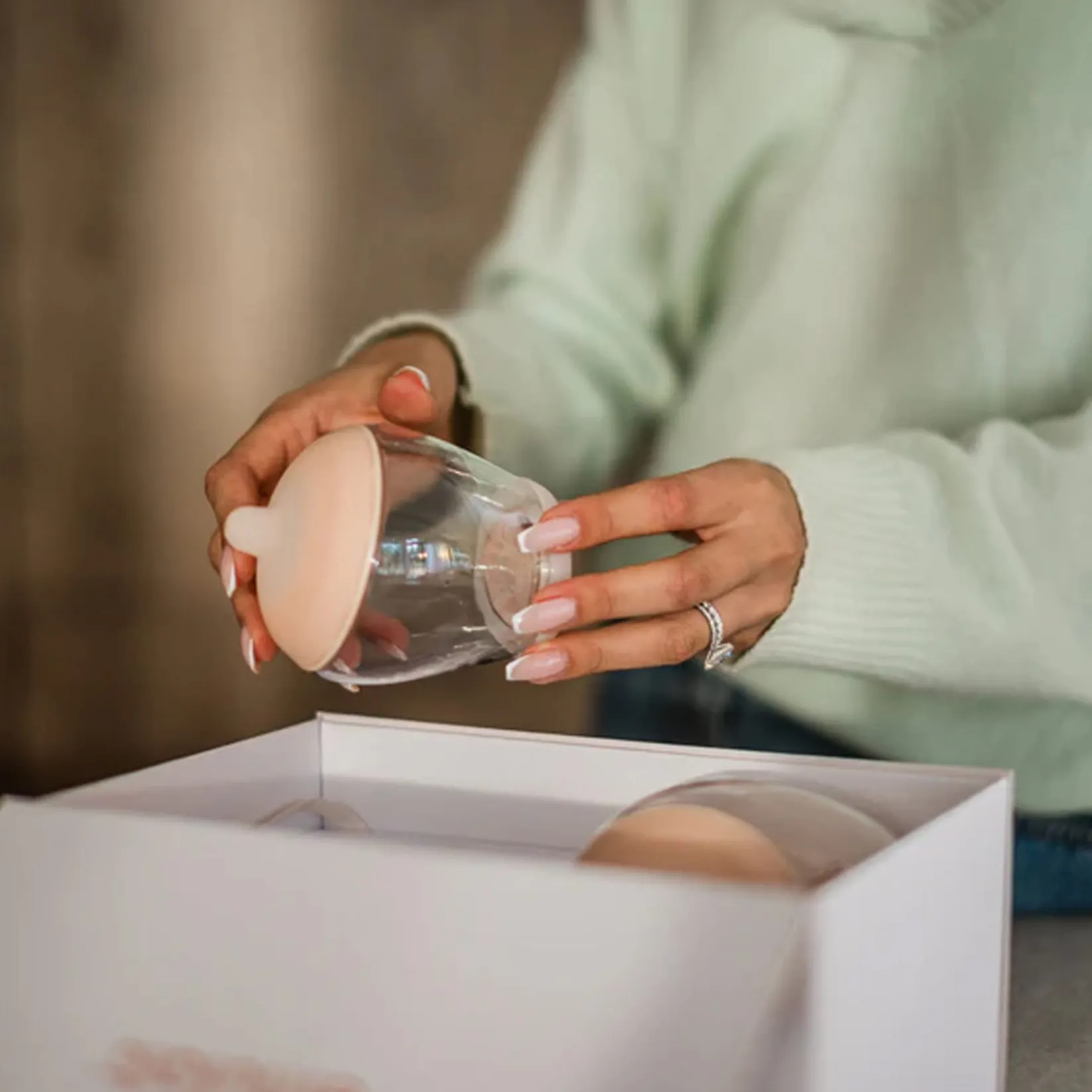 Our customizable nipples mimic the shape, feel, and function of a real nipple. With a softness and texture similar to skin, the nipple stretches and elongates during bottle feeding. This allows your baby to use the natural sucking mechanism they are born with and supports oral and dental development in a way that no other bottle can.