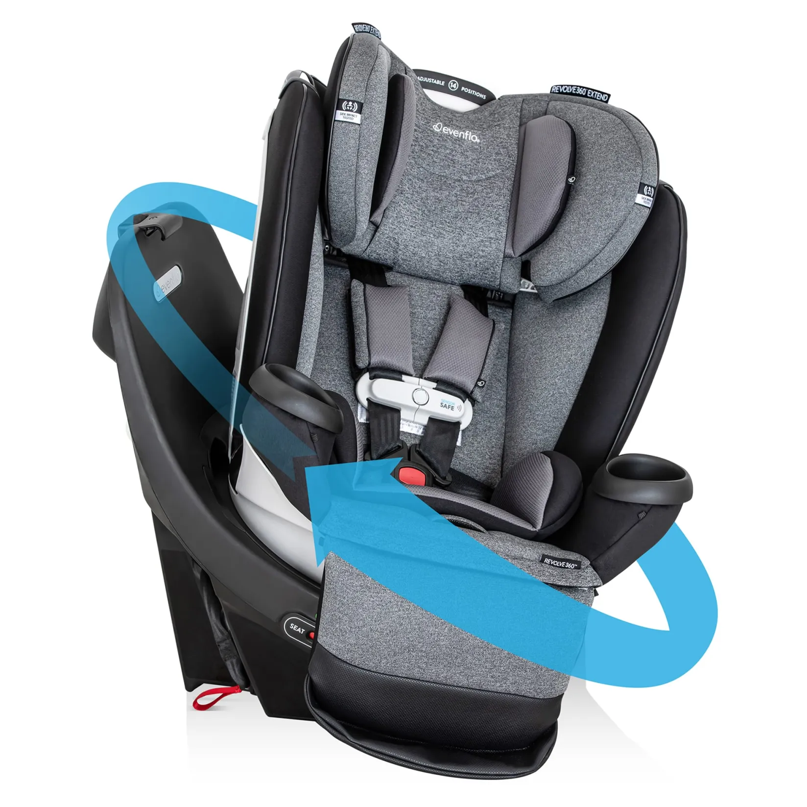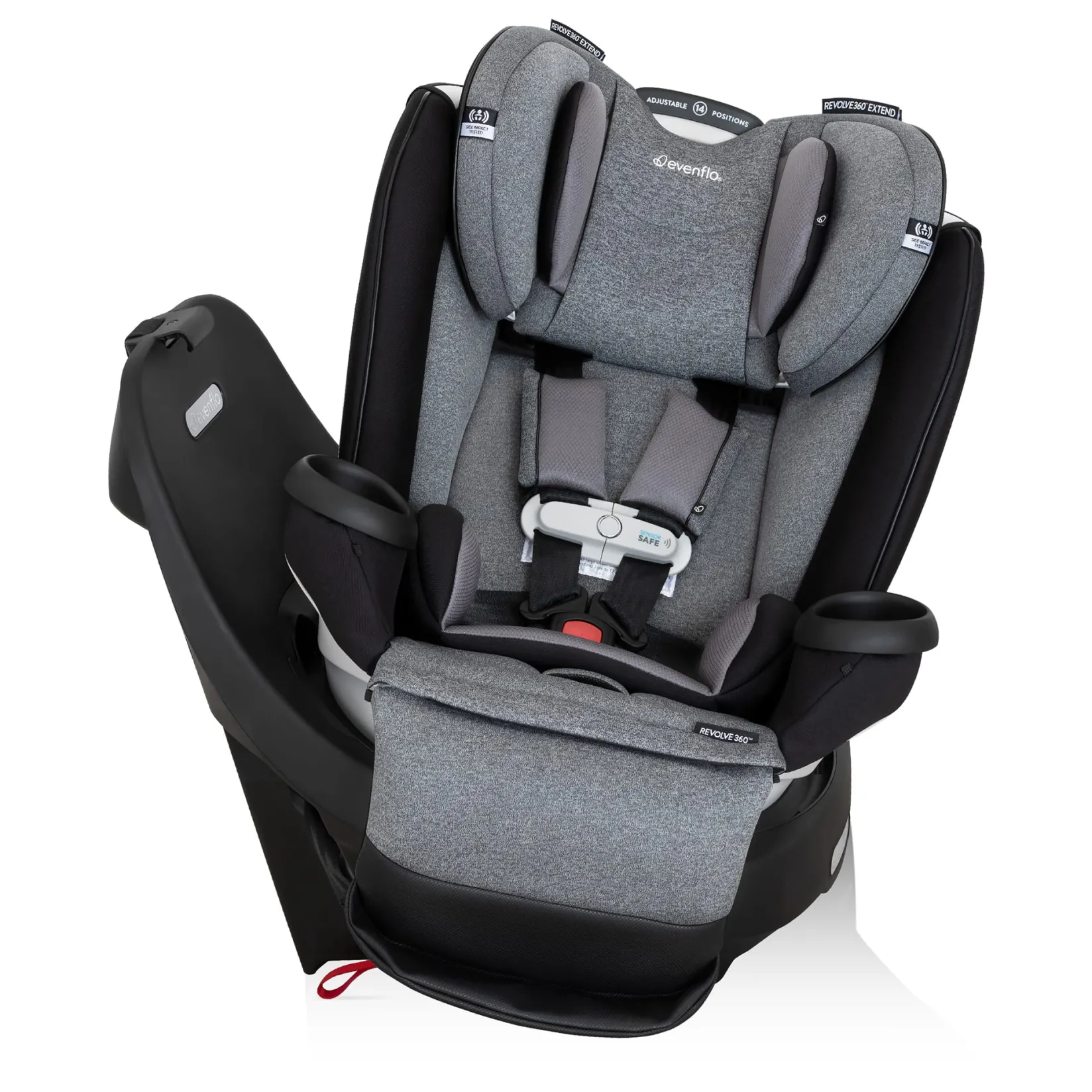 The revolution just got extended! The Evenflo® Gold Revolve360™ Extend All-in-One Rotational Car Seat with SensorSafe™ offers the extended security of rear-facing all the way up to 50 lb. Child safety experts say the longer your child remains rear-facing, the better, and the Revolve360 Extend is here to help with peace of mind all the way around. A spin-off of the Revolve360, America’s bestselling rotating car seat, the Revolve360 Extend offers one-hand, 360° rotation that makes it easy to get your child in and out of the car. But a 360° rotating car seat is just the beginning. You’re looking for a safe car seat — and the smart car seat choice is a connected car seat. The Evenflo Gold Revolve360 Extend will help put your mind at ease when it comes to child car seat safety, featuring SensorSafe to connect you to your little one from the backseat. While your eyes are focused on the road, integrated SensorSafe technology alerts you in real-time to four potentially unsafe conditions from your child’s car seat via your phone: unexpected chest clip unbuckling, temperature too hot or too cold, child unattended in the car, and child seated too long. Install the seat just once for rear-facing and forward-facing modes of use — no need to remove the seat in order to make the switch. Sure360™ Safety Installation System with LockStrong™ and Tether360™, plus a handy bead-level indicator for leveling in seconds, make your one-time installation safe, secure and simple. The best swivel car seat is one that lasts! The Revolve360 Extend is the only car seat you’ll ever need, growing with your child with 3 modes that adapt to every stage: rear-facing (4 to 50 lb), forward-facing (22 to 65 lb) and booster (40 to 120 lb). This innovative car seat also comes with a zip-on, ergonomic leg rest to add comfort for growing legs. On-the-go recline means you can adjust the car seat to the perfect angle without having to uninstall or bother your child. This is the crème de la crème of swivel car seats. Offering good looks and ease at every turn, the Evenflo Gold Revolve360 Extend features our most sophisticated fabrics and elevated touches to finish off your bold moves in style. Join the revolution! At Evenflo, we go above and beyond government standards to create car seats that are safe. The Evenflo Gold Revolve360 Extend meets or exceeds all applicable federal safety standards. It is structural integrity tested at energy levels approximately 2x the federal crash test standard, and it is side-impact tested, rollover tested and temperature tested.