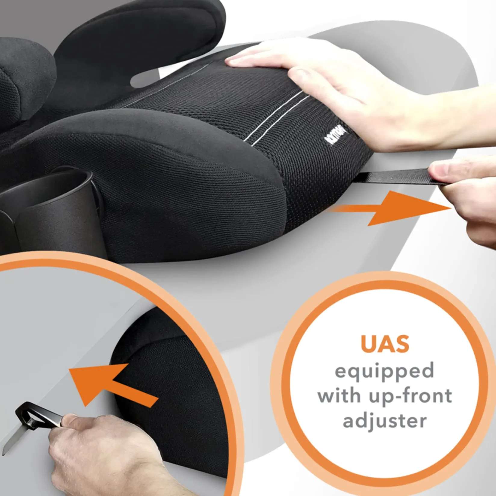 1-hand, up-front adjustable UAS (Universal Anchorage System) secures the booster to the vehicle seat.