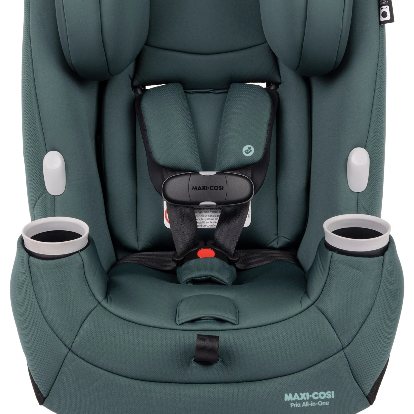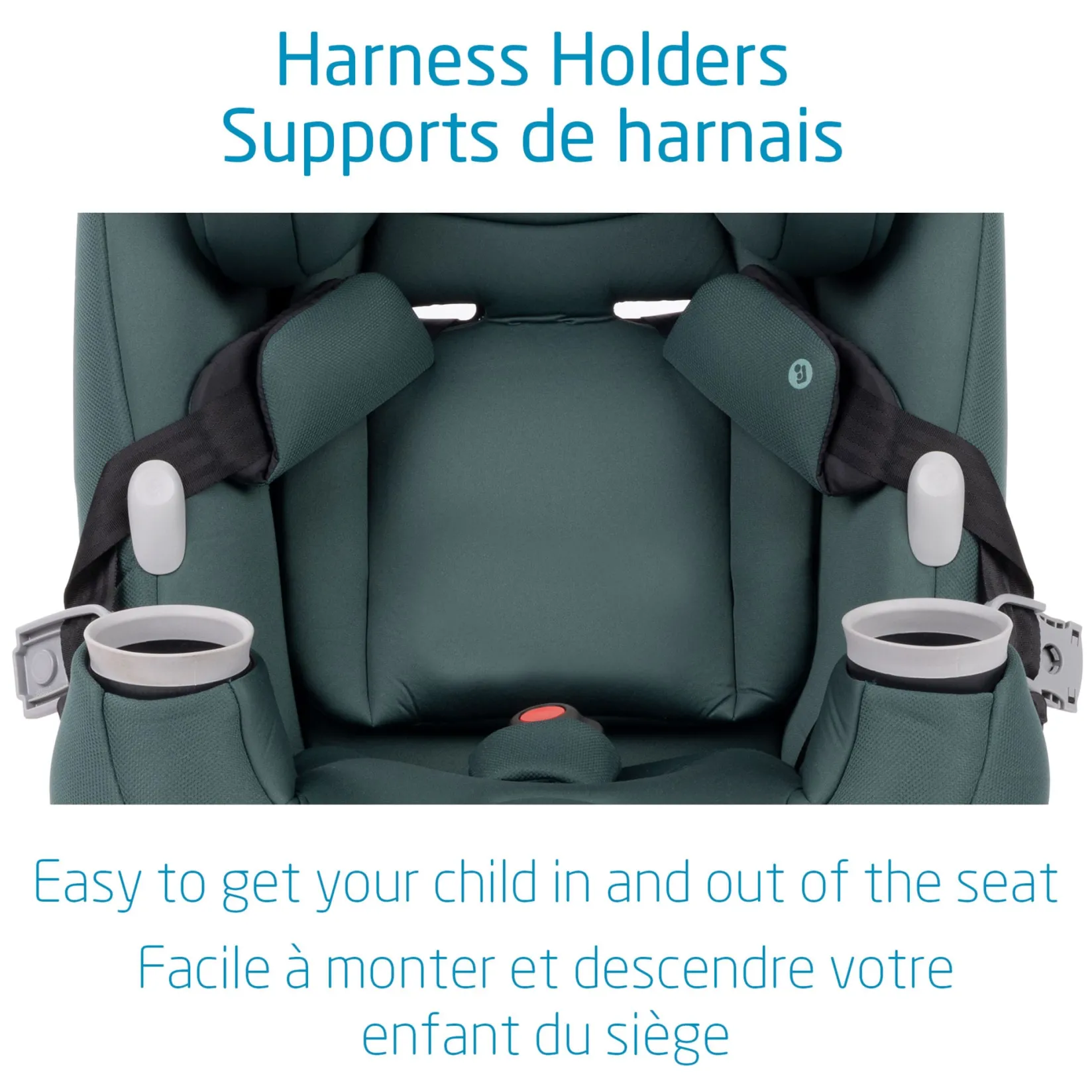-In and out harness holders keep straps out of the way when buckling.