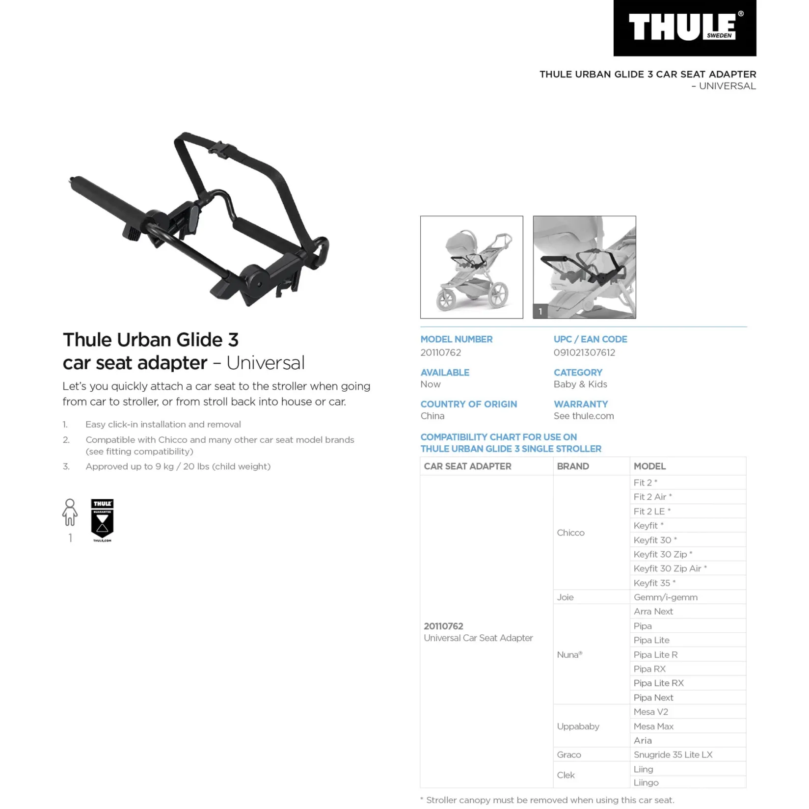 Compatible with the Thule Urban Glide 3 Single stroller when used with the universal car seat adapter (20110762).
