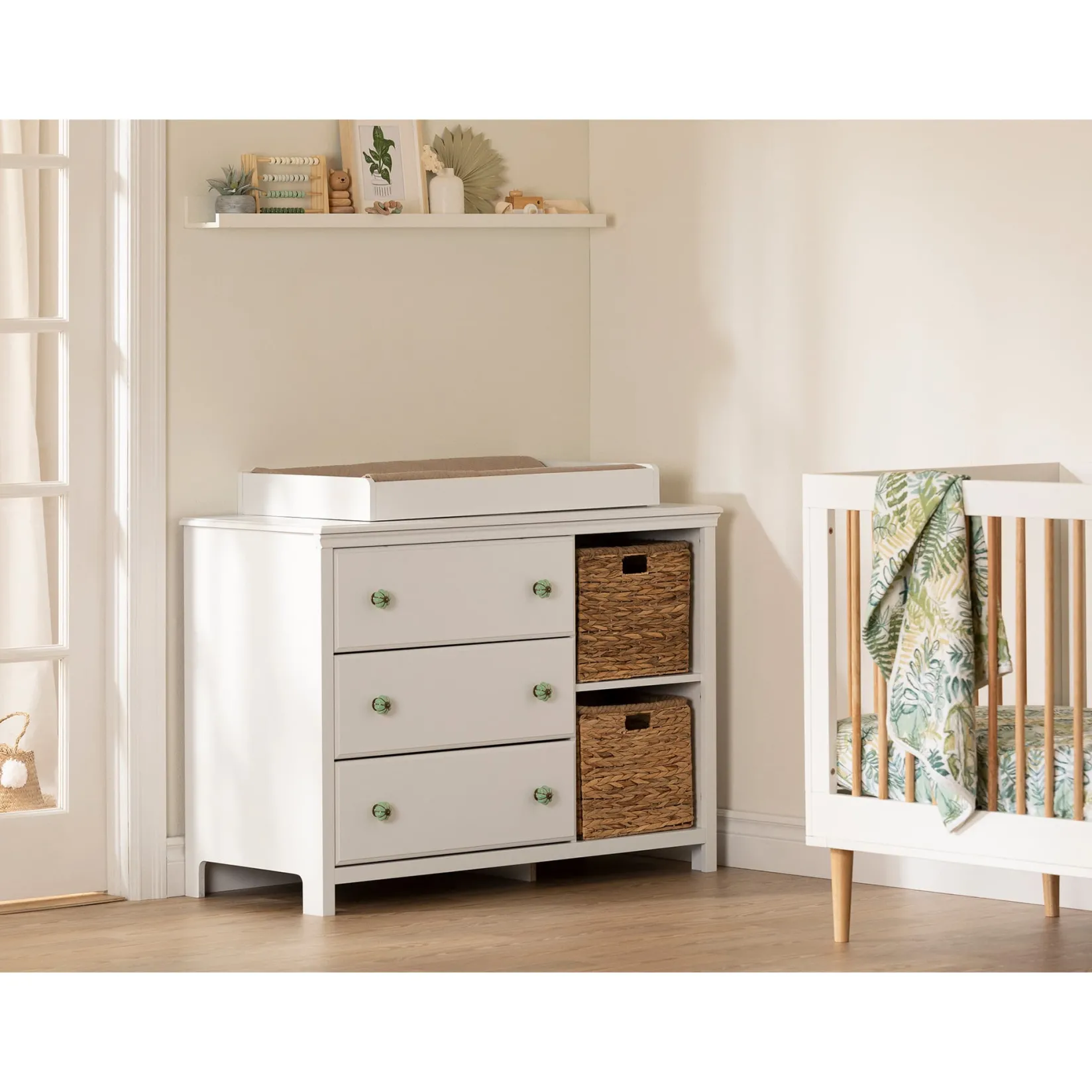 Make the boho style a part of your nursery Go bold and show off the sublime ceramic patterned handles on this piece, which will add a pop of color to the nursery while giving it a fun look. The wicker baskets will create a super-soothing atmosphere that’s in sync with current tastes. Opt for trendy and add a bohemian touch to your little treasure’s cozy nest!