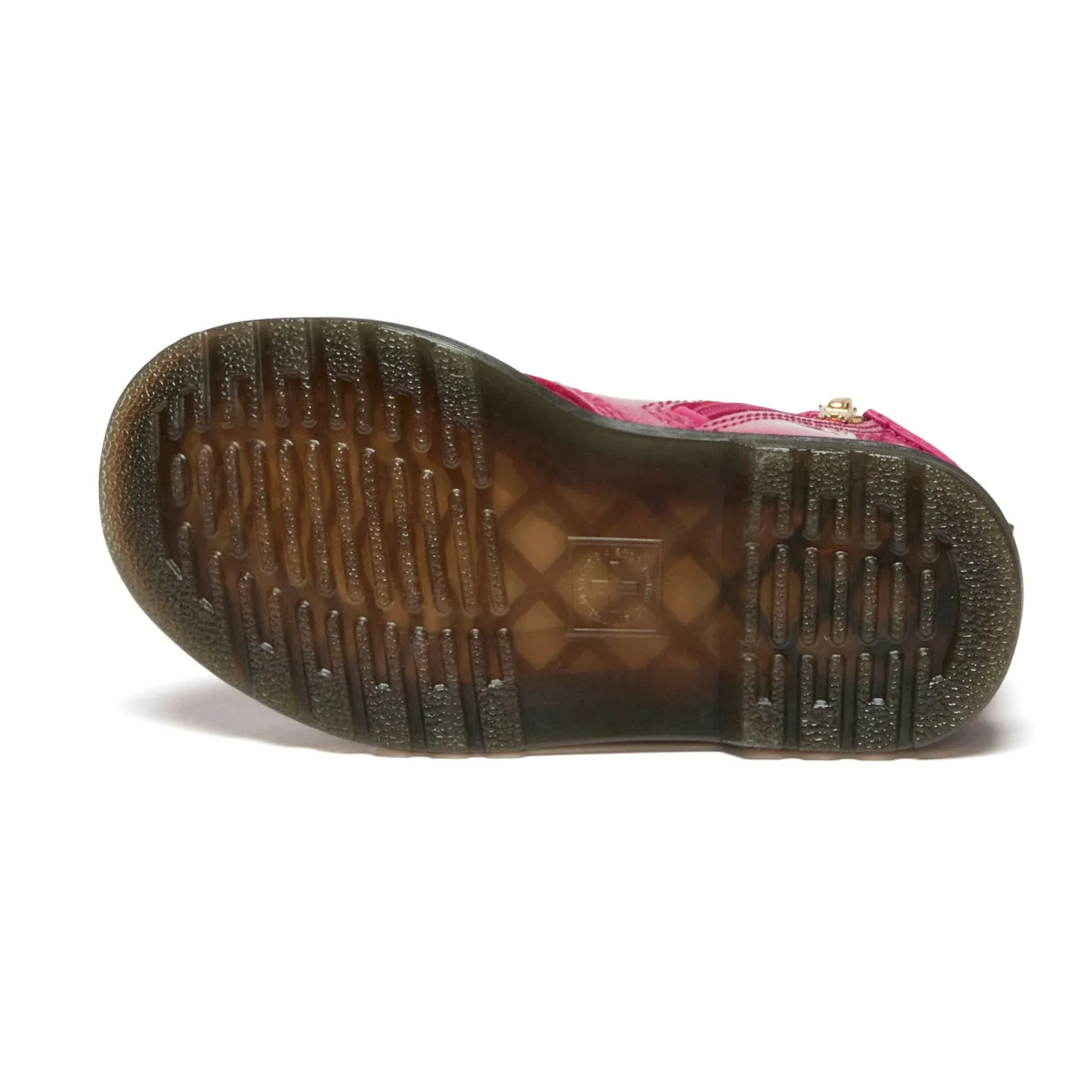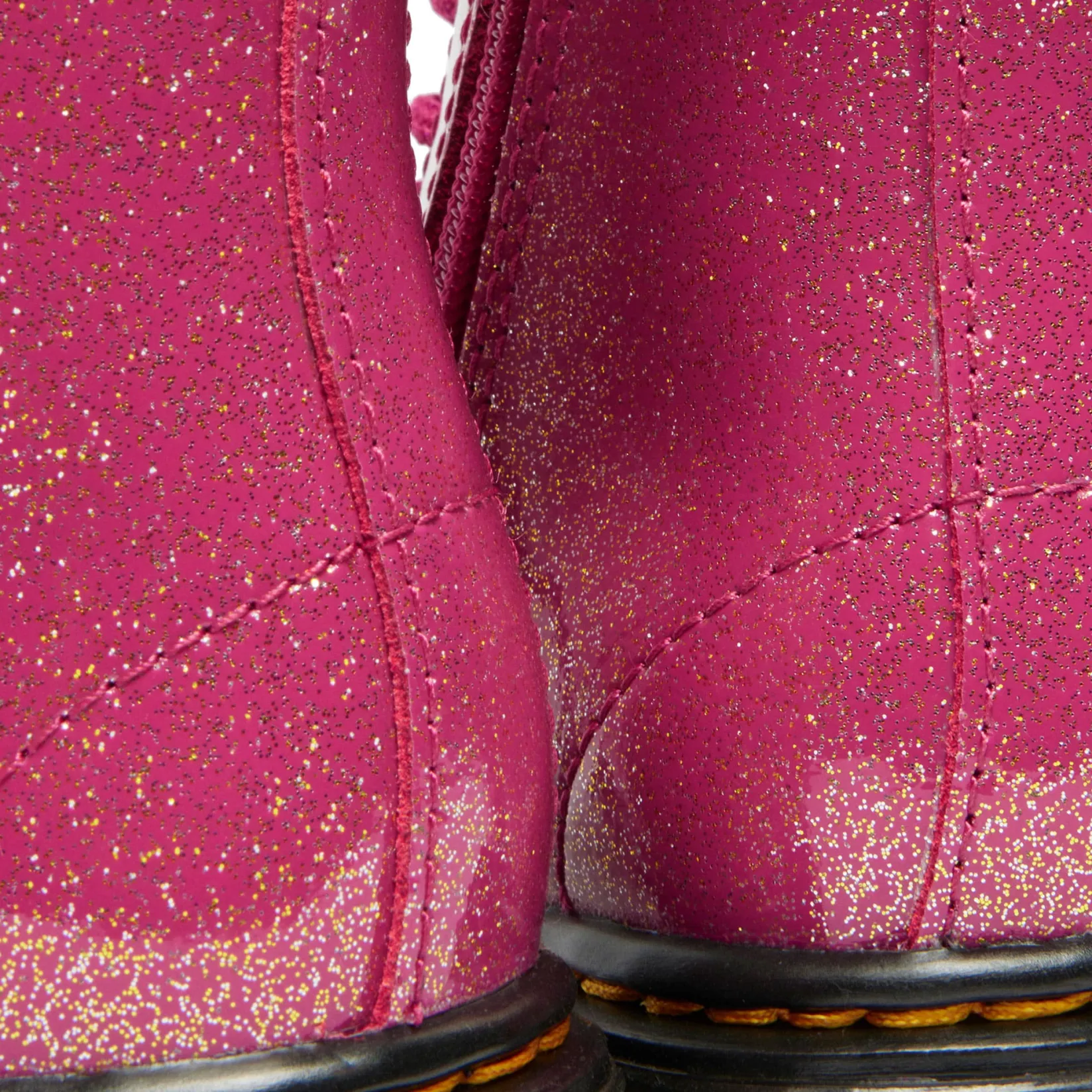 The original DM’s boot — glittered for tiny feet. This revamped design is built for personalities that shine early on. Using Nebula Glitter, a classic patent leather with a high-shine finish and a sparkle effect. The silhouette has all the signature 1460 8-eye boot features you’d expect: a scripted heel loop and yellow faux welt stitching. Along with shiny silver eyelets, an inside zip and a cemented smoke DMS Kids sole.