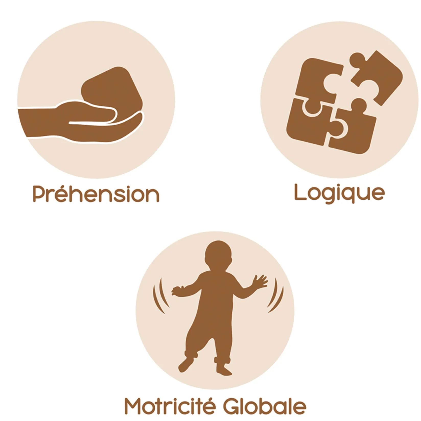 Many colorful play elements arouse the attention of the little ones and train motor and auditory skills. In the shape recognition game, the building blocks are pushed into the matching recesses. A small marble run with a ramp is just as inviting to play and try out as the motor loop, the three horns or the catapult, with which the marble can be catapulted into the air. A small, rotating mirror rounds off the playful features of the play table.