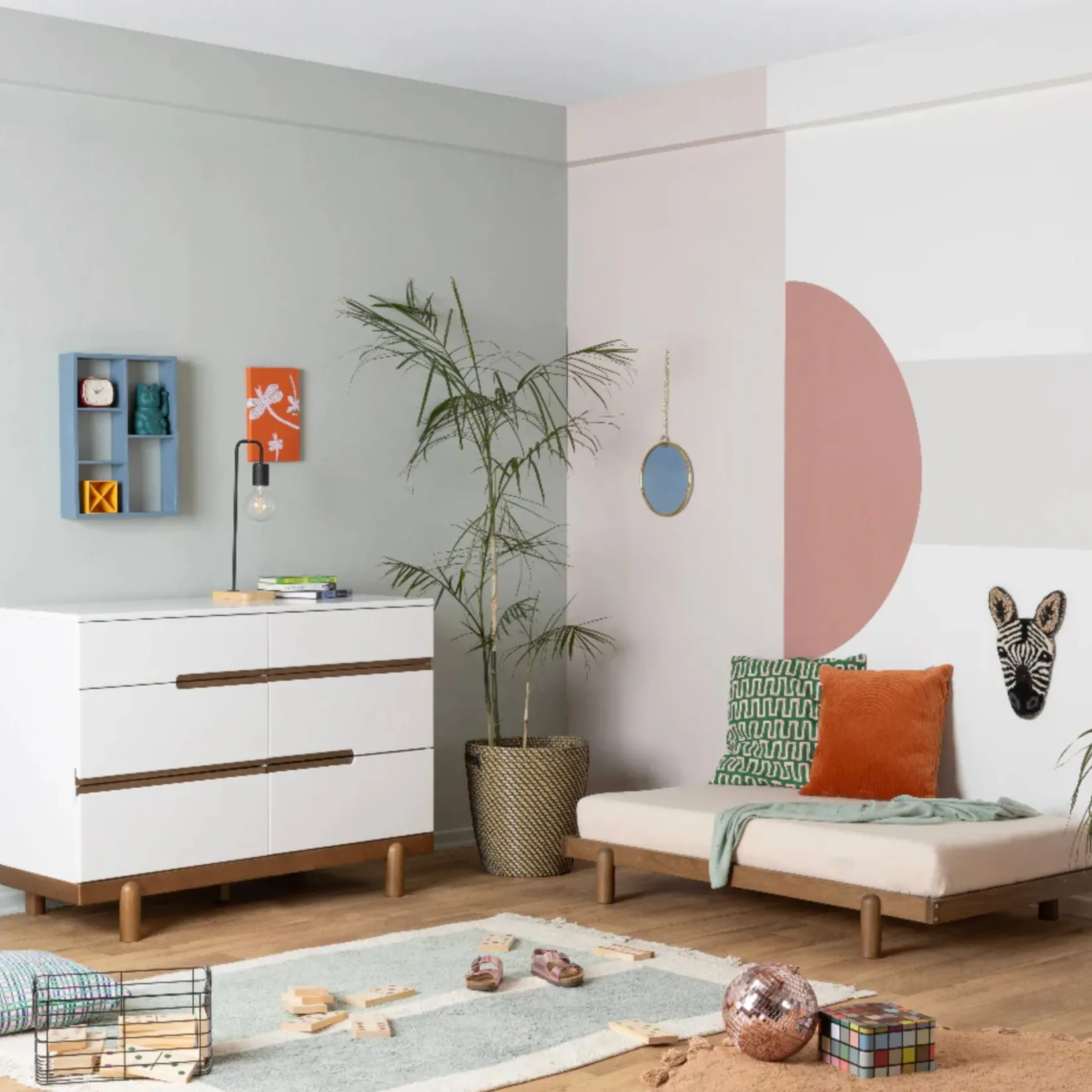 Experience organizational bliss with the 48″ Bliss 6-Drawer Dresser – a stylish solution for storing all of baby’s necessities. Its sturdy rubberwood legs and innovative drawer design bring a playful energy to any room. Use it alone or pair with a changing table to maximize space in the nursery (or anywhere else that could use some lighthearted organization).