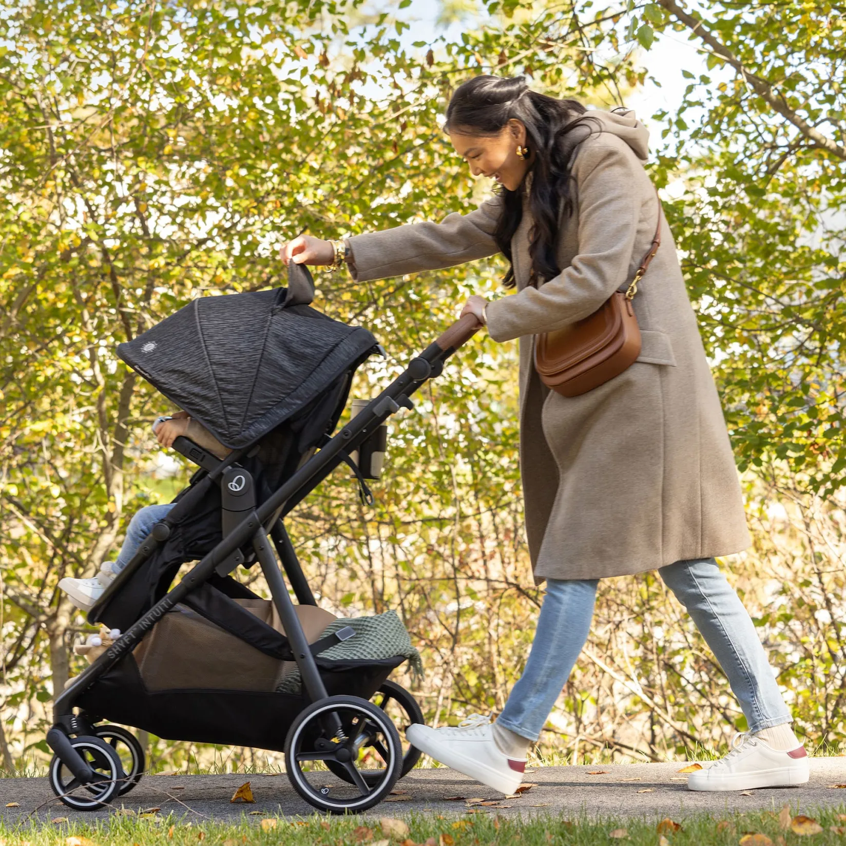 ELEVATE OUTINGS: Roll with luxurious amenities, including a 3-position, articulated leatherette handle, height-adjustable UPF 50+ canopy to fit kids up to 43 in., linked brakes to lock both rear wheels at once, and plush, stylish padding