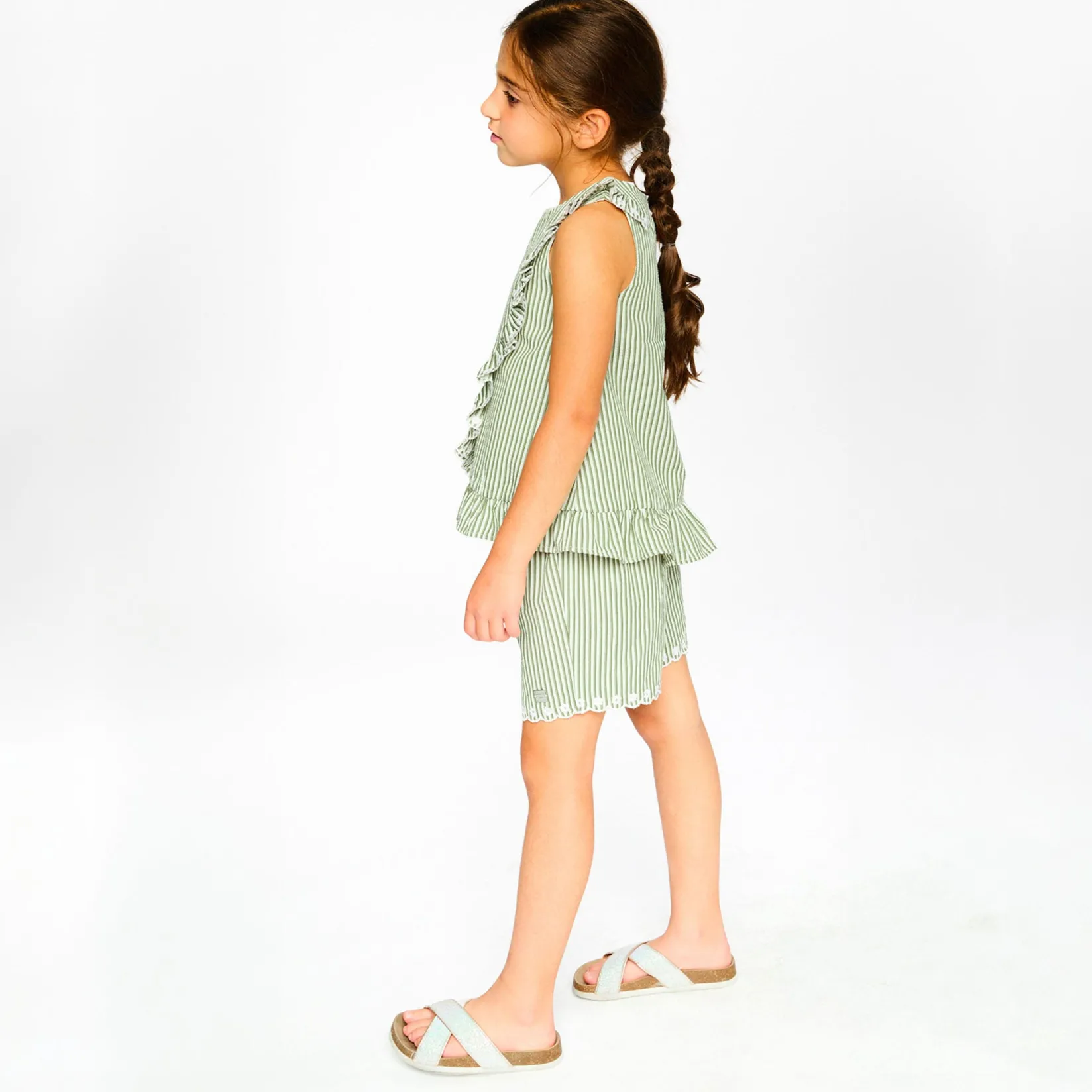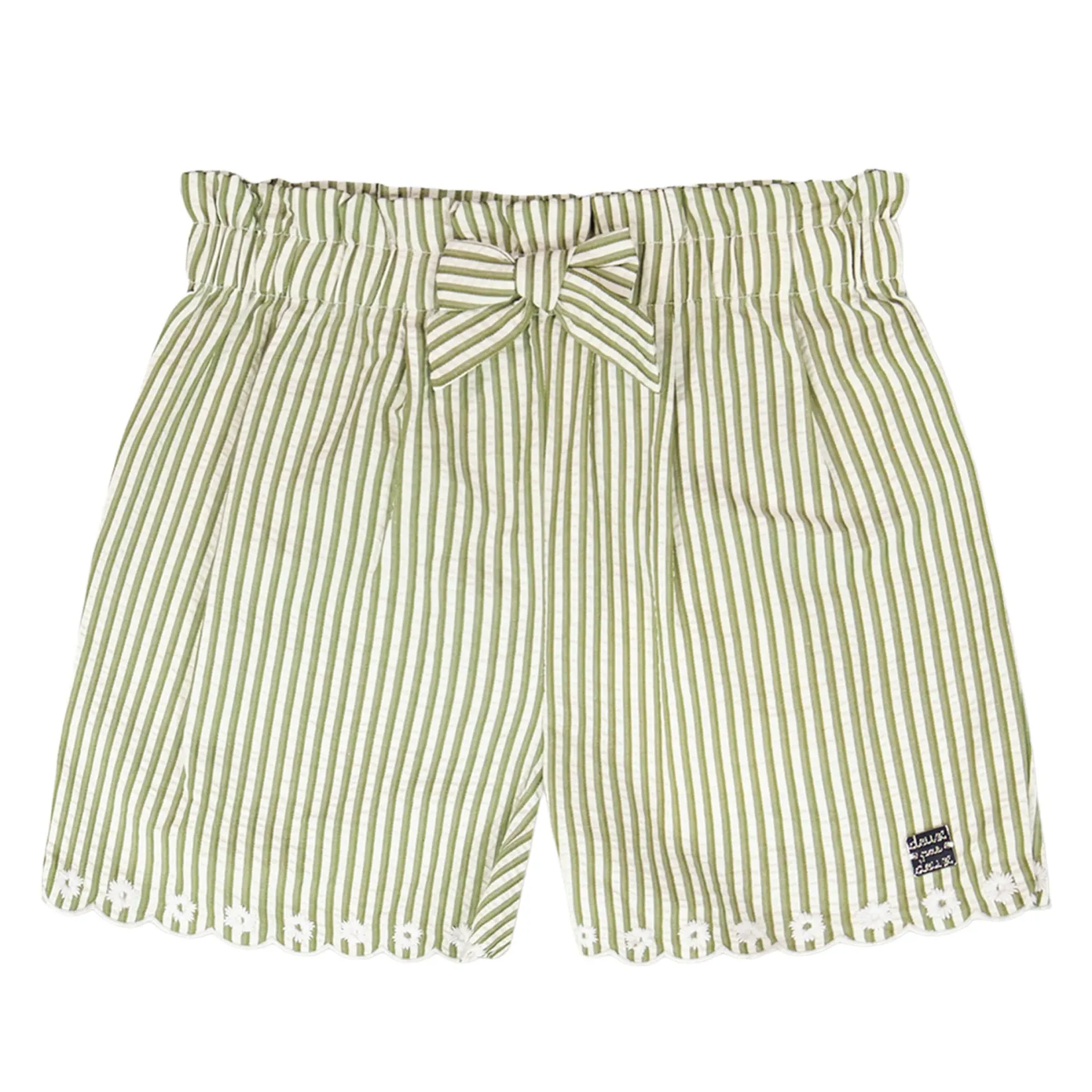 The shorts in green and off white stripes with embroidery bring a chic twist to casual wear. These bottoms are designed with delicate embroidered bottom hems, an adjustable tie at the waist, and a breezy striped fabric that gives both comfort and style. Made from a soft polyester and cotton blend, they are ideal for pairing with any top from the “Under My Straw Hat” collection.