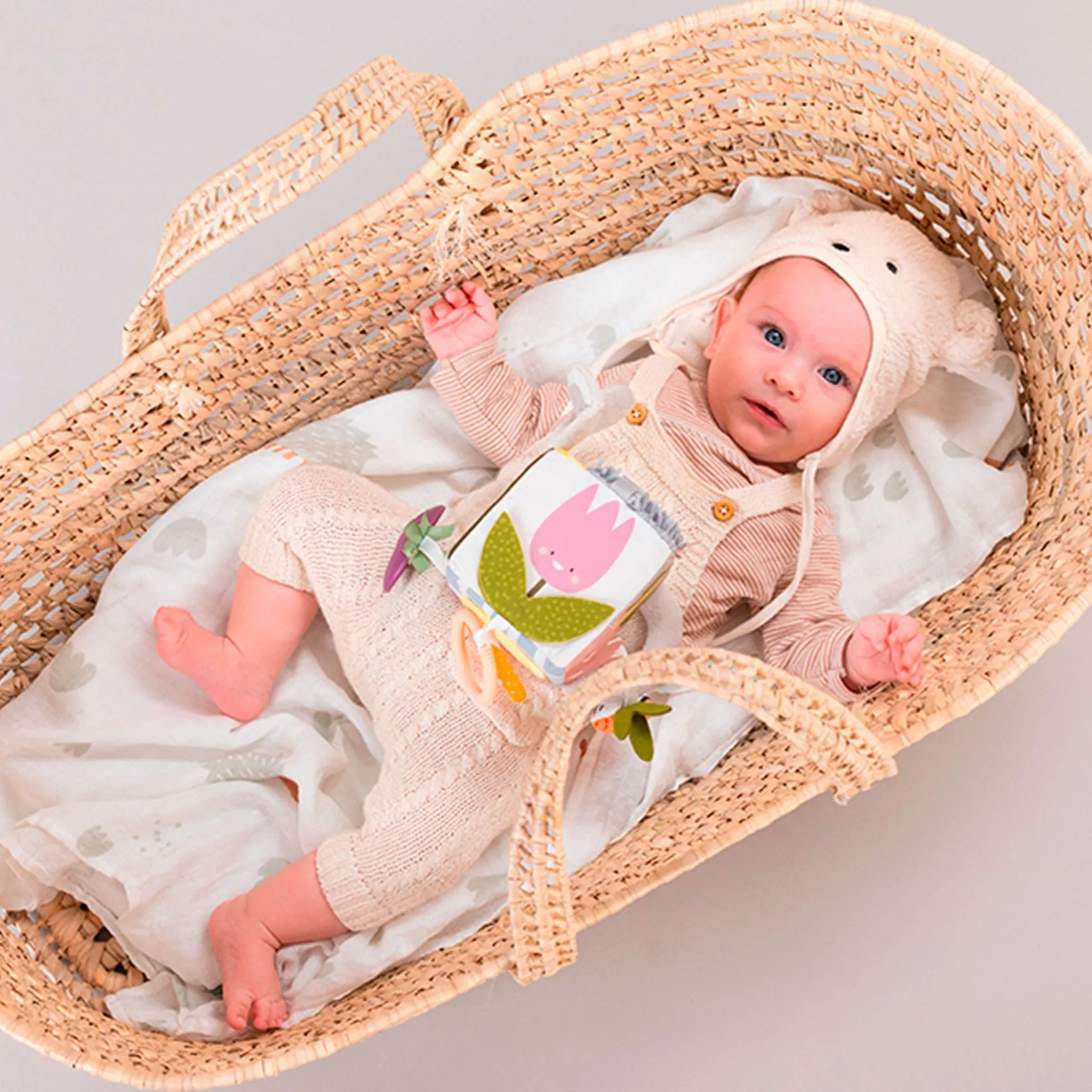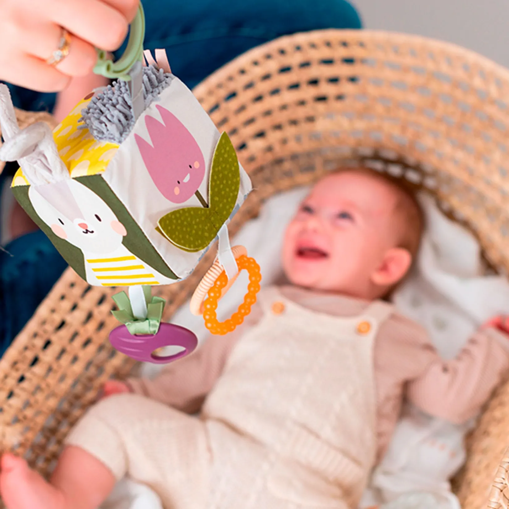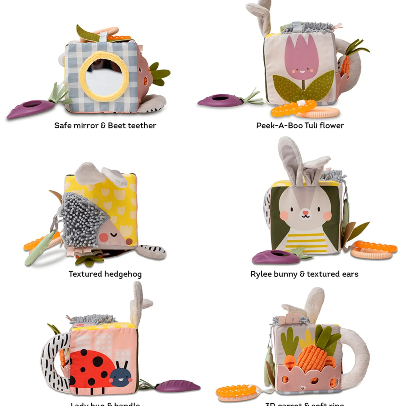 – Features a peek-a-boo flower, baby-safe mirror, beet-shaped teething toy, bunny ears that make a crinkling sound , rustling rings, different fabric textures, a carrot crunch and much more.