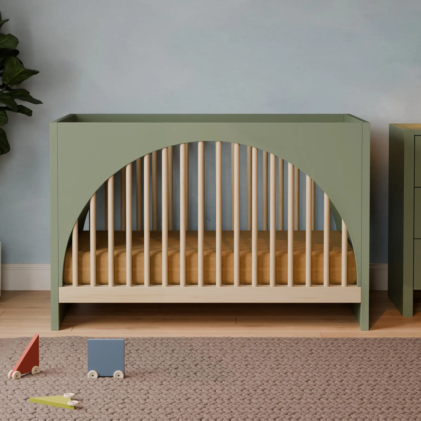 The Moab 3-in-1 Convertible Crib evokes pop art and postmodernism-inspired design with its use of playfully arched front and back panels and modern tambour side paneling. The Moab was designed to grow with your babe, converting from standard crib to toddler bed to daybed. GREENGUARD Gold certified and finished with non-toxic paint and stain, the Moab is a safe and sustainable choice for any nursery.