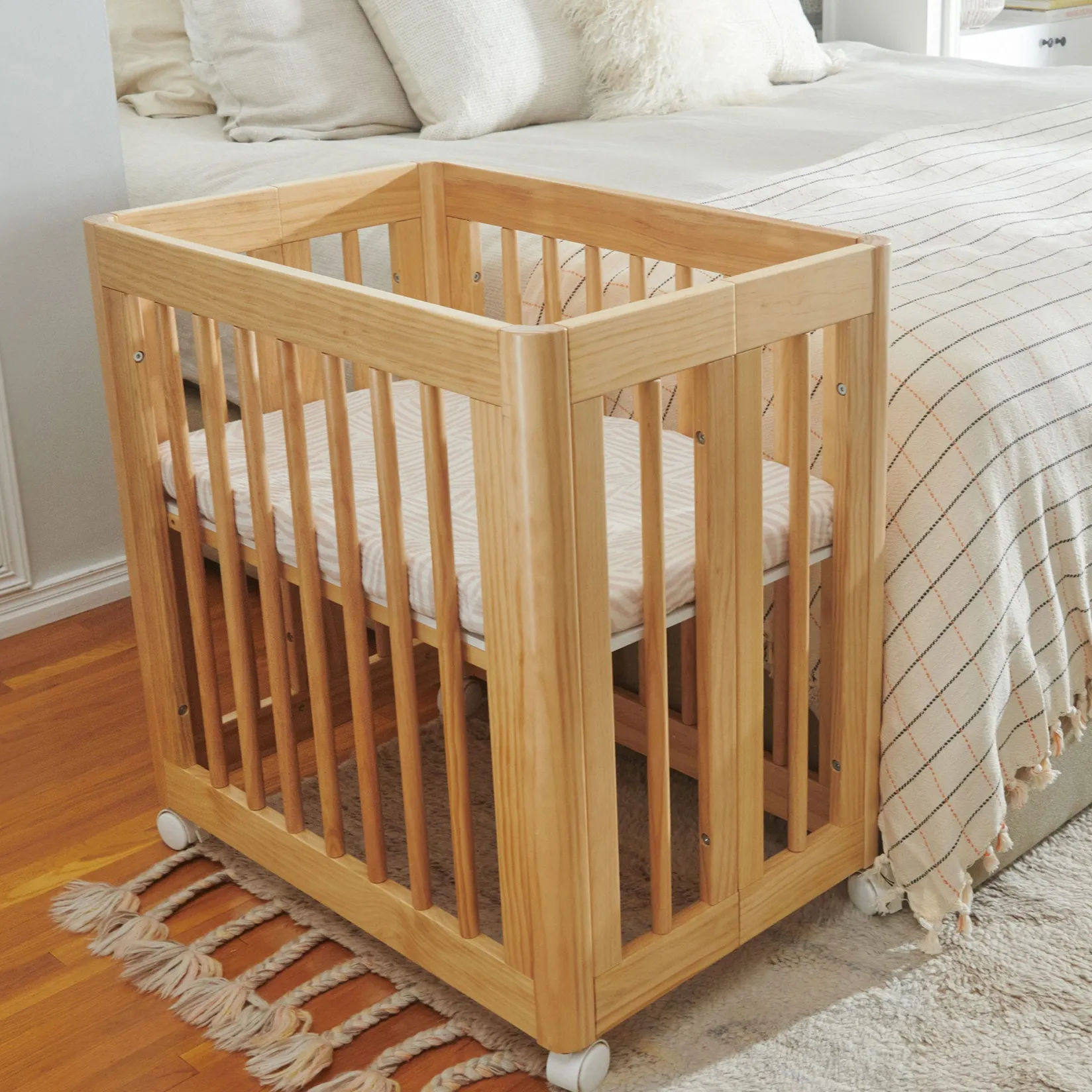 -PORTABLE & ADJUSTABLE HEIGHT: Glides easily from room to room on removable locking caster wheels in each stage. For safe co-sleeping, adjust between four height options in the bassinet and midi stages, and three heights for the full-size crib.