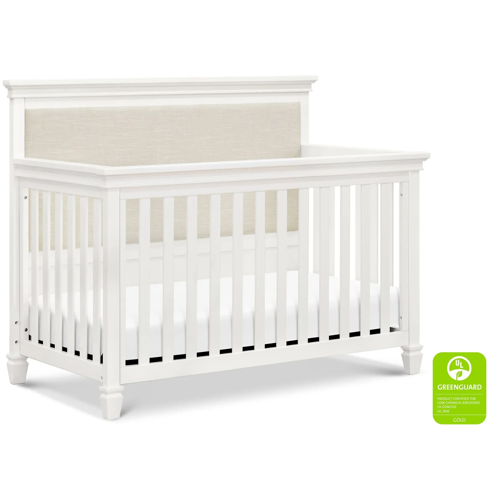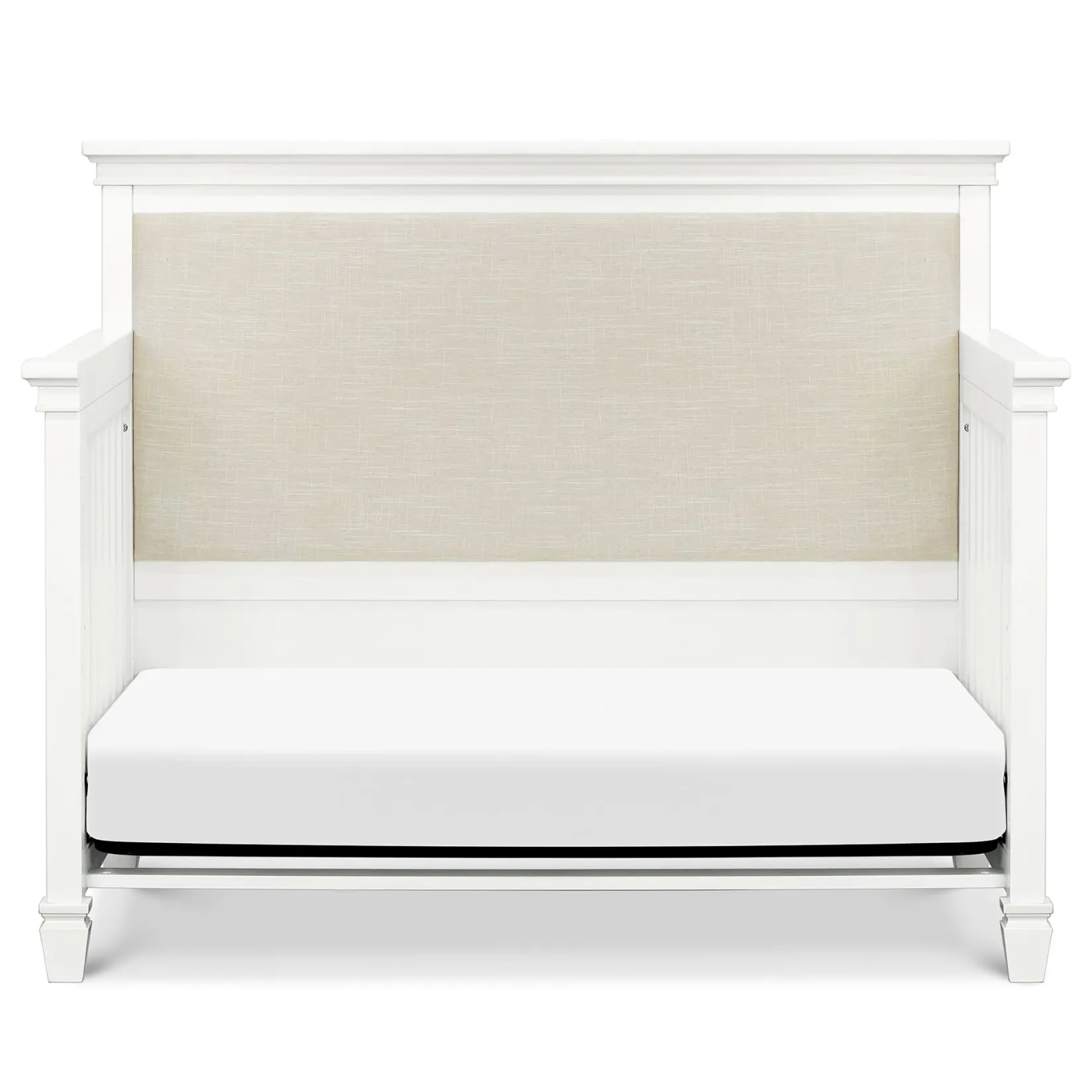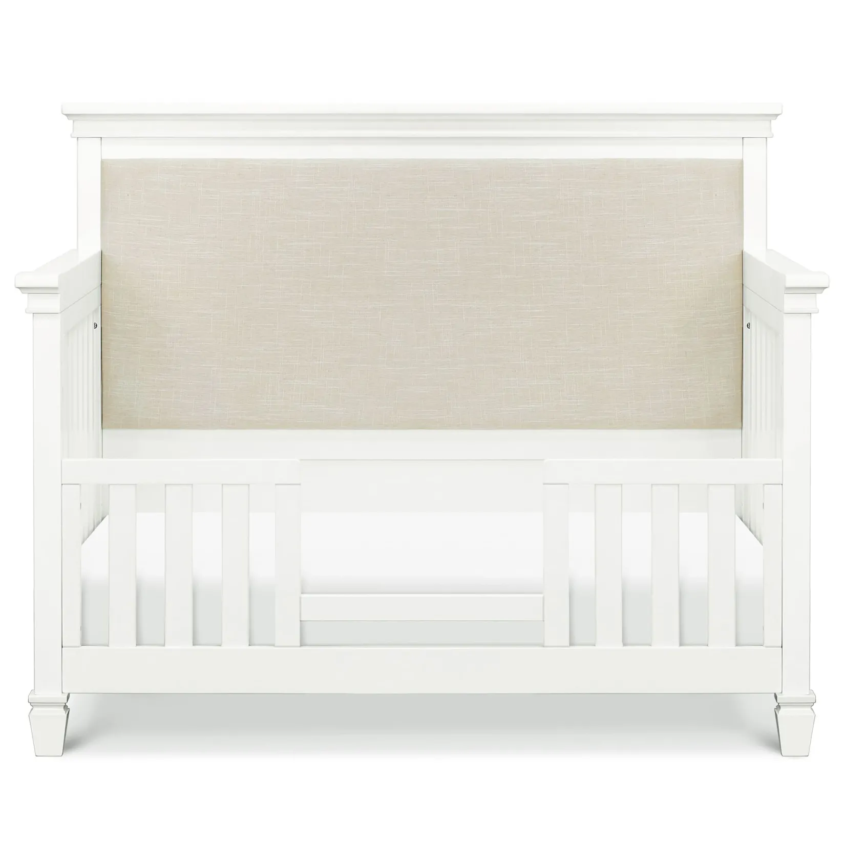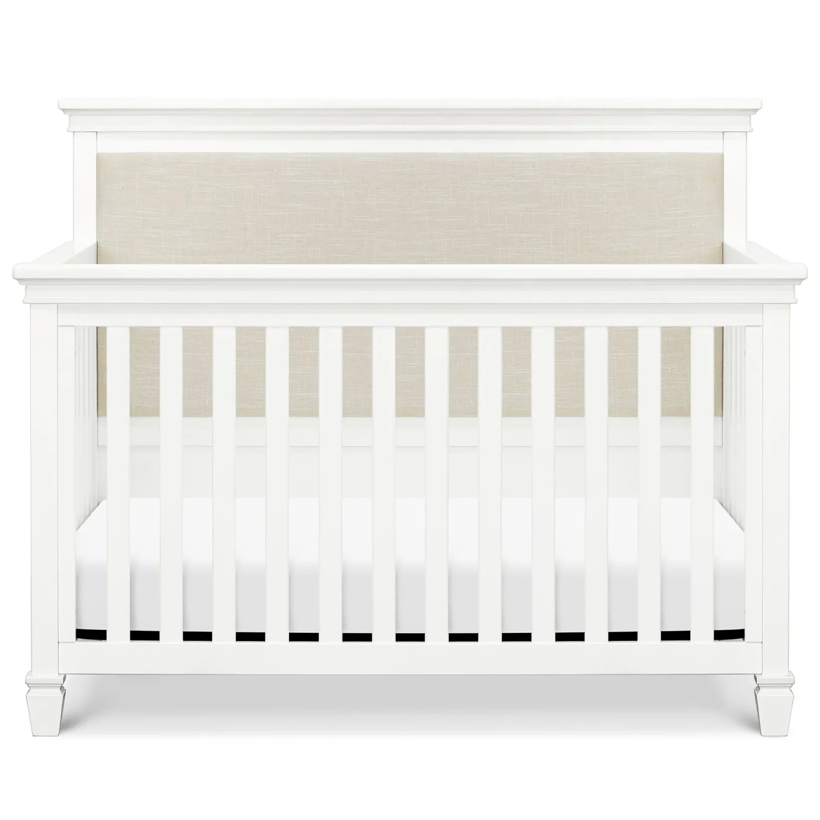 The Darlington 4-in-1 Crib brings the sophistication of relaxed French country style into the nursery. The Darlington balances delicate lines, gently detail molded tapered feet, and a lush upholstered back panel. Crib converts to a toddler bed, daybed, and full-size bed.