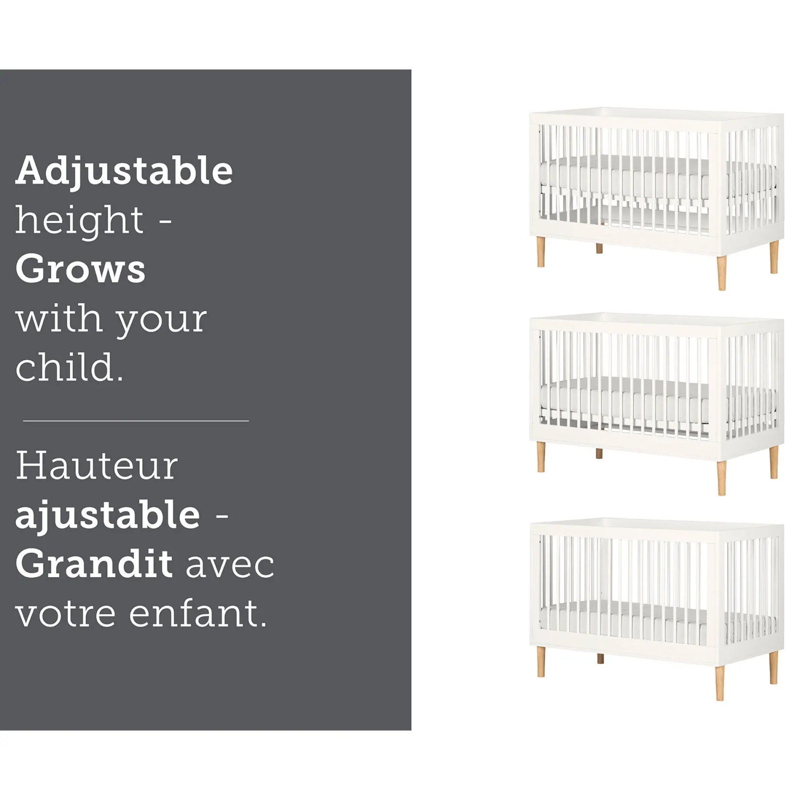 Babies grow very quickly, so it’s important to choose furniture that’ll last over time. This crib is a real 3 in 1! You get a crib, a transition bed, and a small bed all at once – so this piece will evolve with your child, from newborn to toddler. All you have to do is replace the bars at the front with a toddler rail (not included), then remove it once baby is ready.