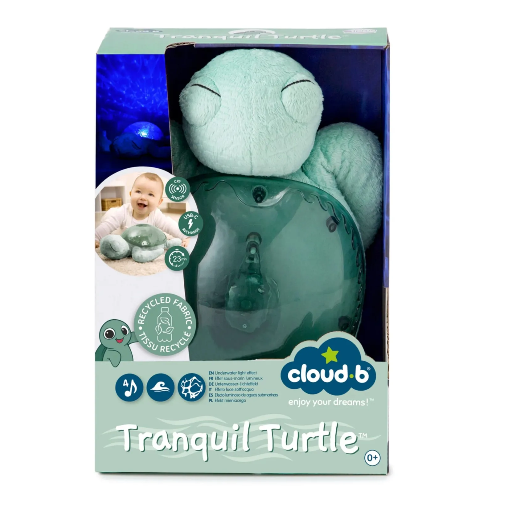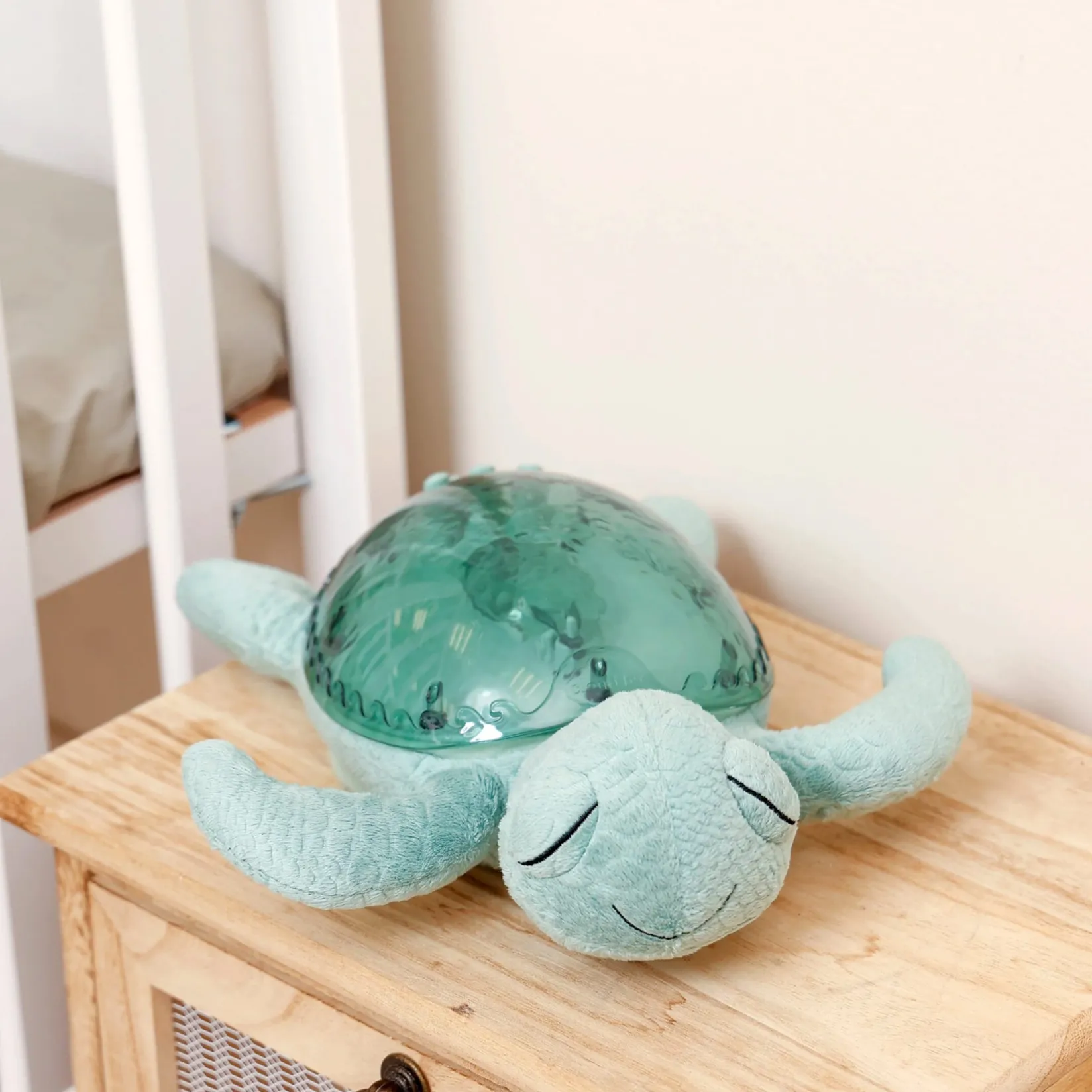 Tranquil Turtle™ Rechargeable – Green is a cute musical turtle, made from 100% recycled polyester fabric and padding, that glows with a soft light and projects moving ocean waves on the bedroom ceiling.