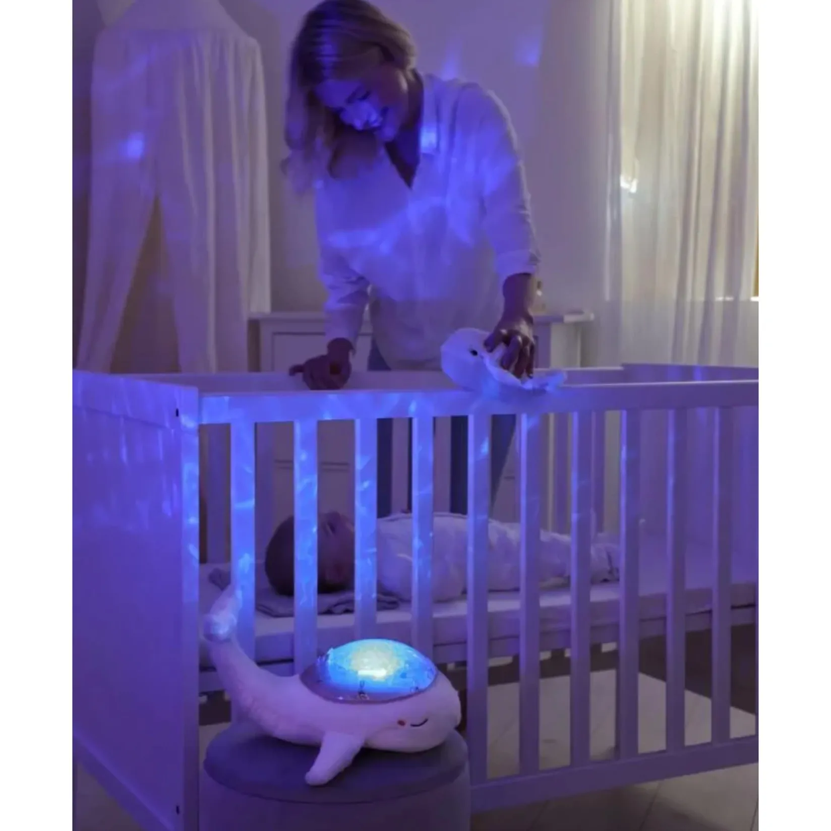 This pretty whale diffuses a soft light and projects on the ceiling of the room the waves of the ocean in movement thanks to a unique and patented mechanism. A marine melody and the sound of the waves (white noise) will soothe the little ones to take them on the way to sleep. Its plush material is ultra-soft.