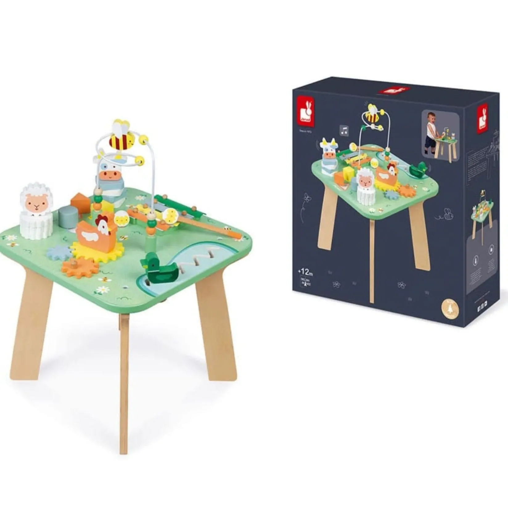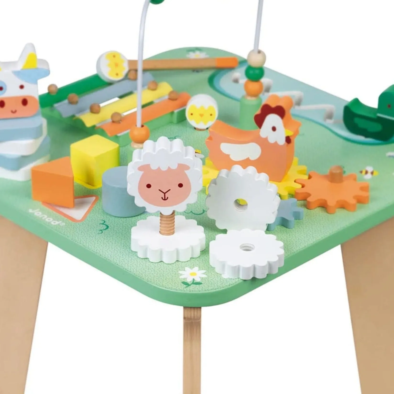 Head to the countryside with this multi-activity table where your mini will find all the farm animals! So, here we go for 7 activities: 2 animals to stack in 2 different ways to develop fine motor skills, a maze with a duck to walk in its pond to strengthen hand/eye coordination, a system of gears to rotate to make baby aware of the cause and effect relationship, 3 built-in cubes to learn shapes, an abacus to develop concentration and a metal xylophone with 2 sticks for musical awakening.