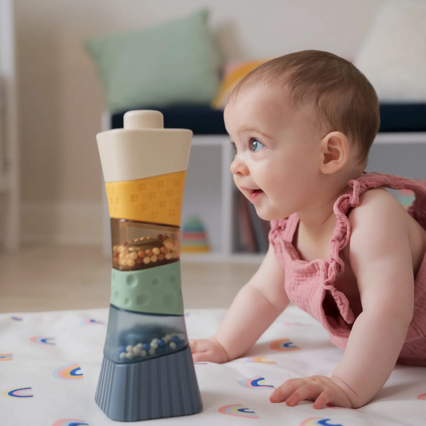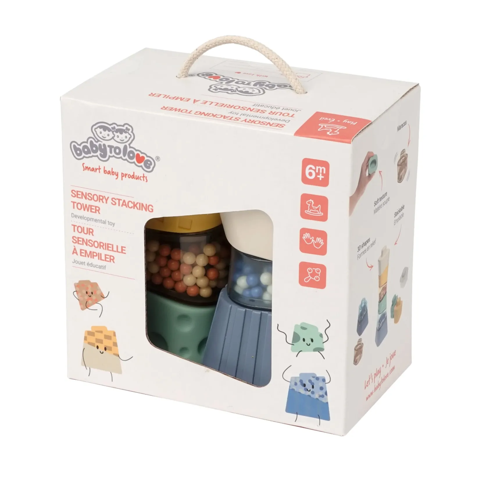 The sensory stacking tower is made up of various parts with vibrant colors and different textures. The combination of soft and hard elements helps develop baby’s sense of touch, while some pieces contain colorful beads visible through transparent sections, creating captivating visual effects. When baby shakes or stacks the parts with beads, a gentle sound similar to rain can be heard, adding an auditory dimension that will delight them. This multisensory toy promotes the development of fine motor skills.