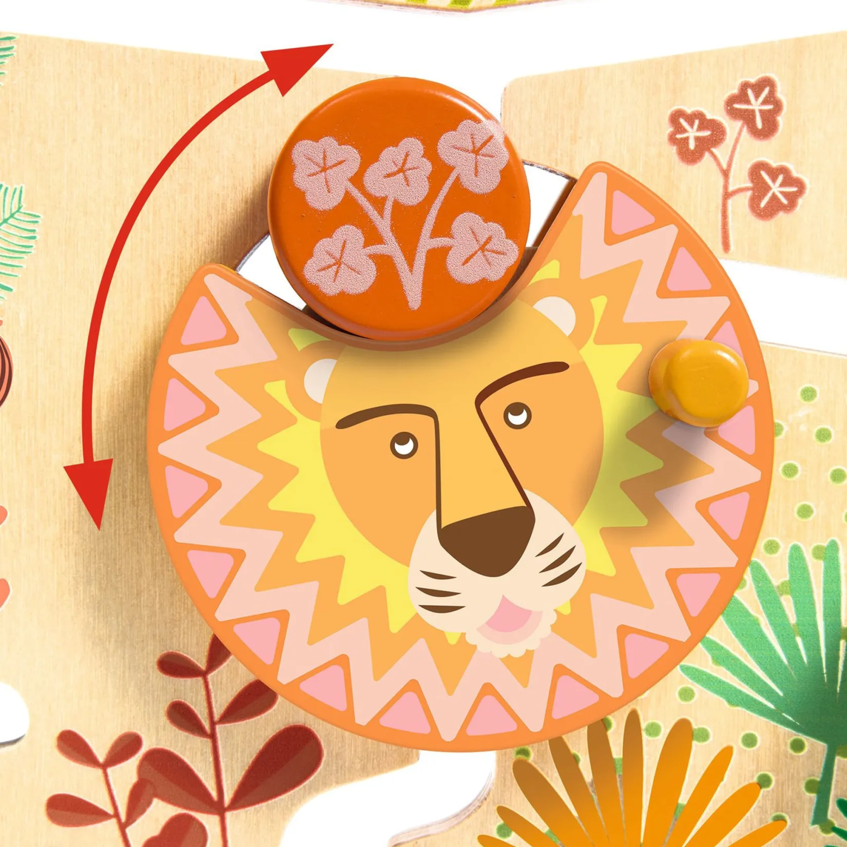 A wooden slide maze with sliding discs, for children 18 months and up. The baby moves the discs into the ‘entrances’ (3 spaces) at the top of the slide and then lets them slide down. In the middle of the maze, 3 animals stop the discs. To set them free the child has to turn the lion, pull the giraffe or move the hippo aside, to let them finish their crazy race.