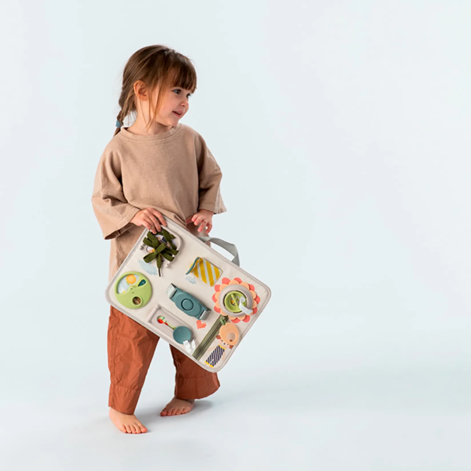 The Snap ‘n Learn Board is an interactive toy for toddlers 18 months and up. It features laces for tying with a peek-a-boo bear, a rotating discover disk with a peek-a-boo flower and  squirrel, and a twist lock revealing a peek-a-boo butterfly. The central buckle helps toddlers practice motor skills and explore sound reactions. Additionally, the zipper with a leaf and the peek-a-boo  sliding snap promote motor skills and understanding of cause and effect.