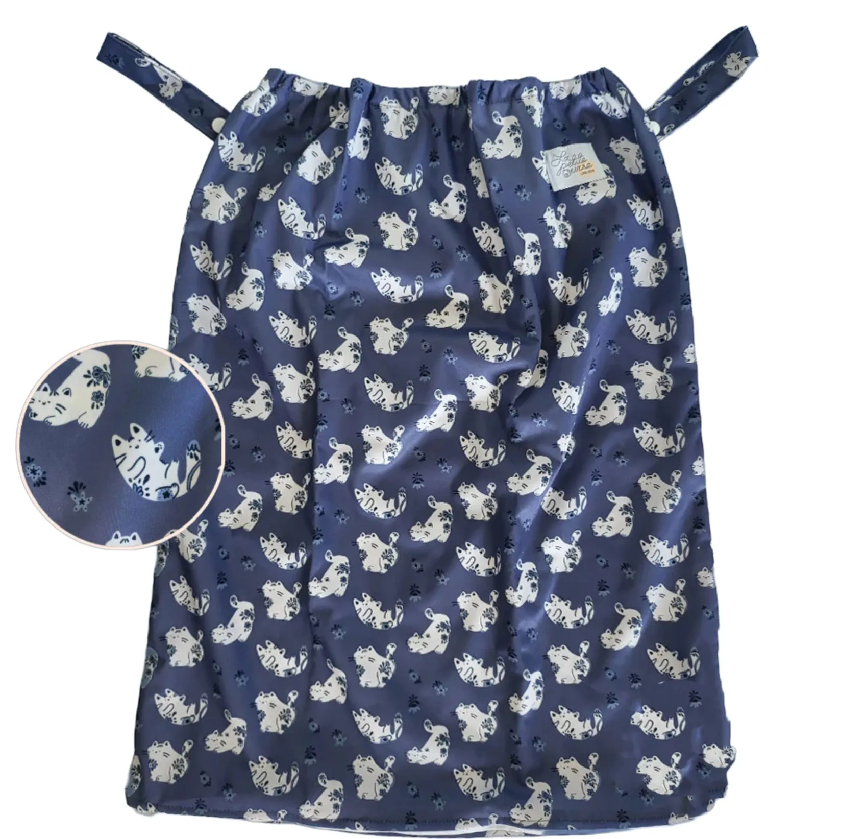 A durable bag made of waterproof recycled polyester for disposing of your used diapers after use. Each bag can hold approximately 20 diapers. The bag has an elastic band that can be placed in a dirty diaper pail or hung using its two straps.