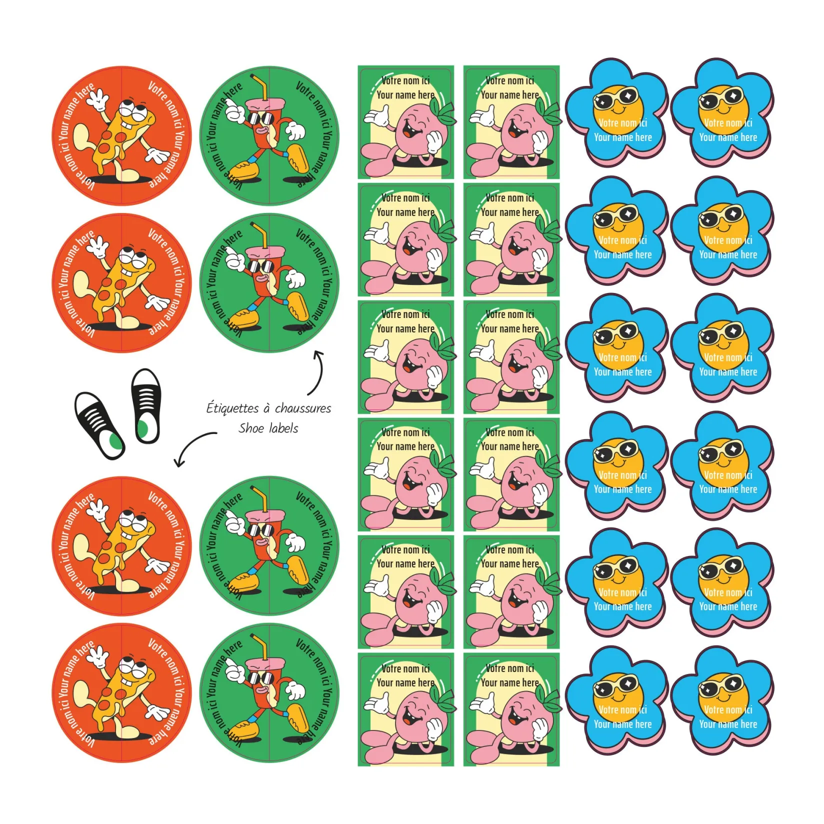 The Essential Edition offers the perfect balance to accompany children from daycare to school. It contains 150 self-adhesive labels in various sizes, ideal for marking both small and larger items. It also includes 8 pairs of labels specially designed for shoes, making it easier for children to manage their morning routine independently. Resistant to water, cold, heat, and steam, they are dishwasher, washing machine, dryer, microwave, freezer, and refrigerator safe. No ironing required. Simply apply them to a clean, dry surface and allow 24 hours for them to dry before exposing them to moisture. Each label is personalized with a name and/or phone number printed on two lines of 16 characters.