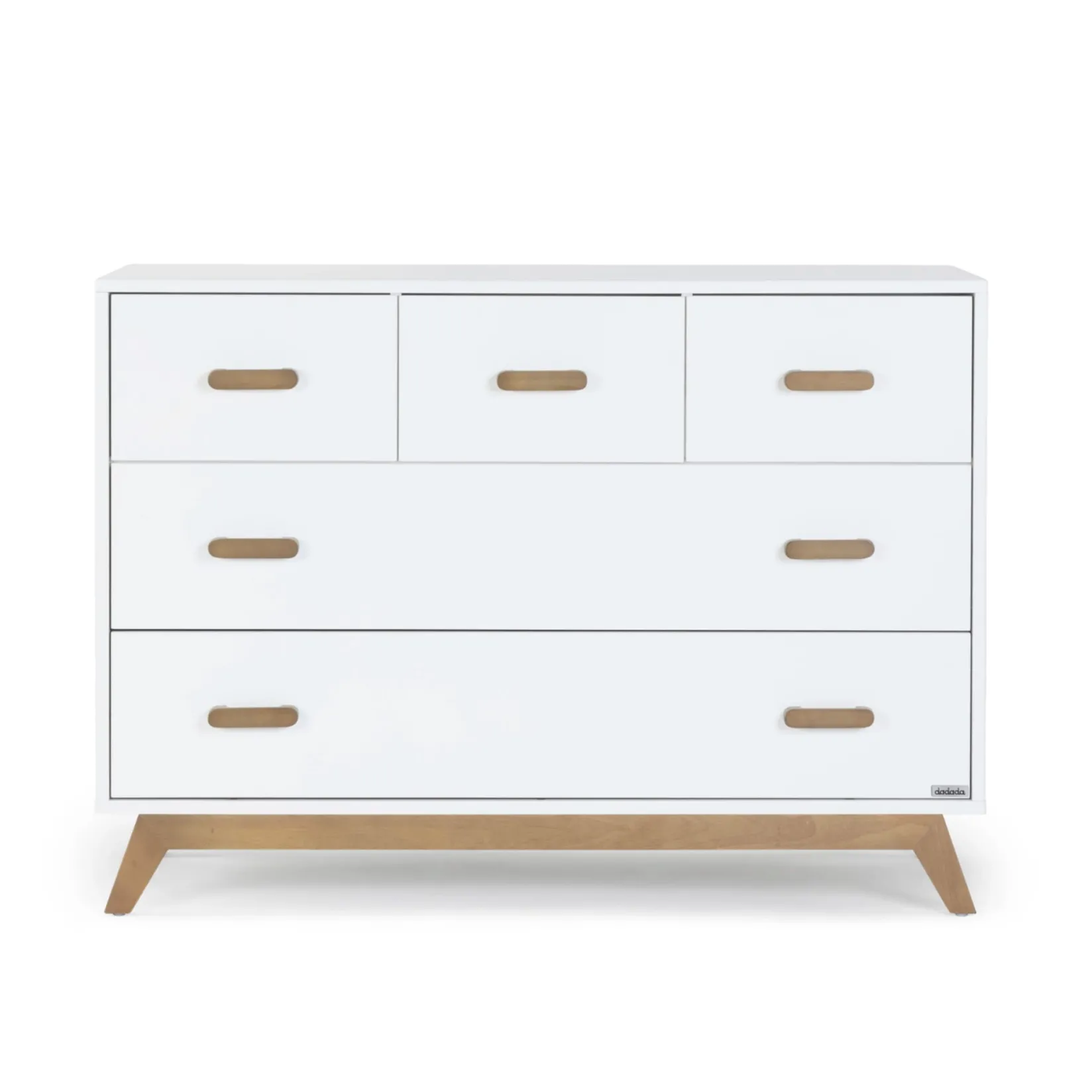 The 48” modern Soho 5-drawer Dresser’s classic style pairs perfectly with the Soho 3-in-1 Crib, or adds a pop of mid-century style to any room on its own. Safe, stable, and strong, with sturdy angled legs and solid wood handles, forged steel support, and a baby-safe painted finish.