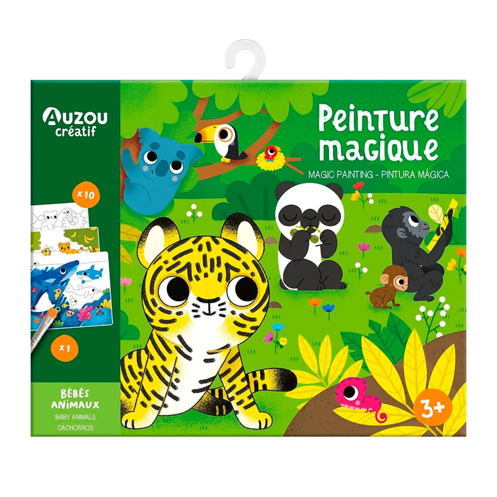 Dix dessins sur les bébés animaux afin d’apprendre à peindre sans dépasser grâce à un pinceau en bois à tremper dans l’eau pour faire apparaître les couleurs.