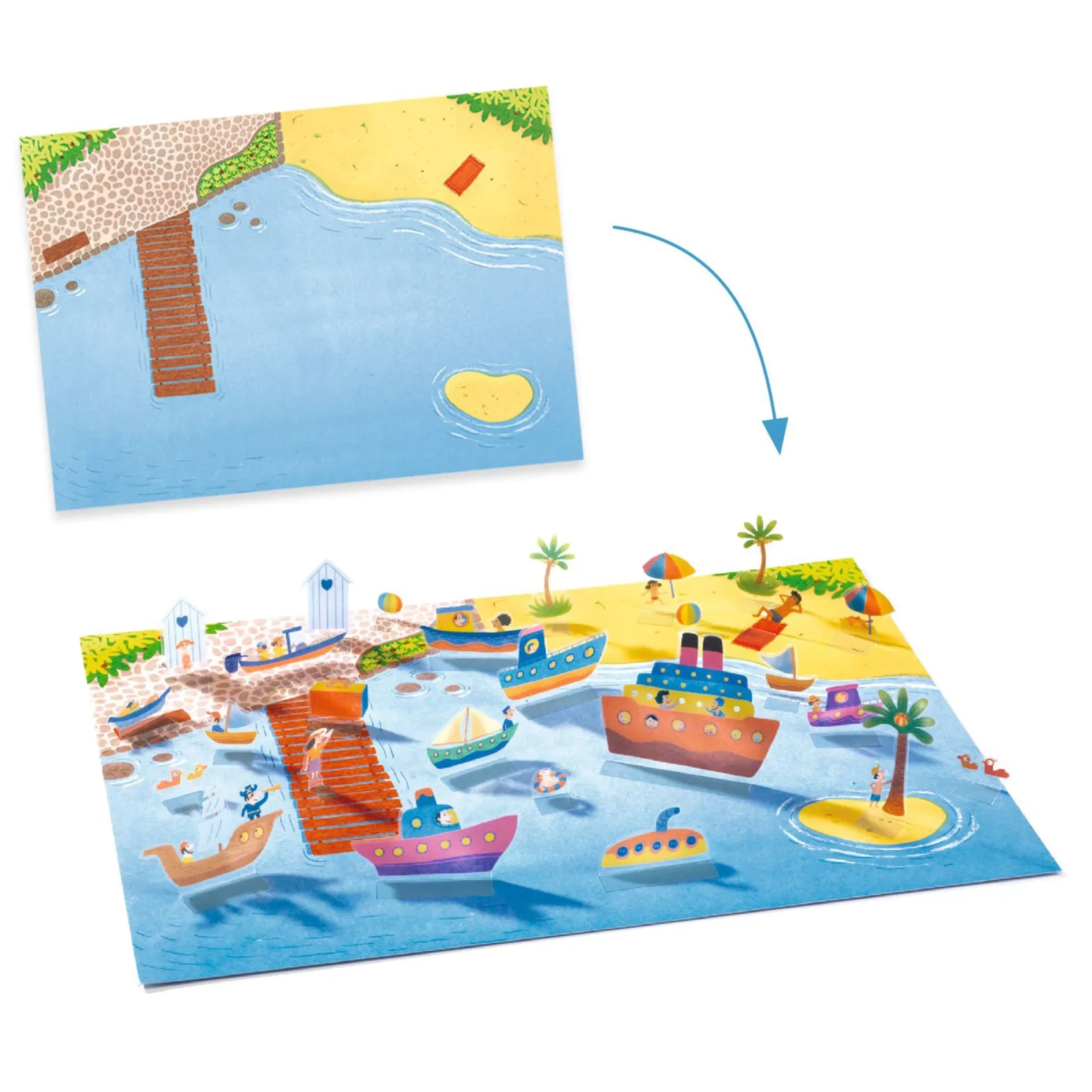 Children put the reusable stickers on the large pictures, then lift them up one by one… to create 3D scenes and make up countless stories!