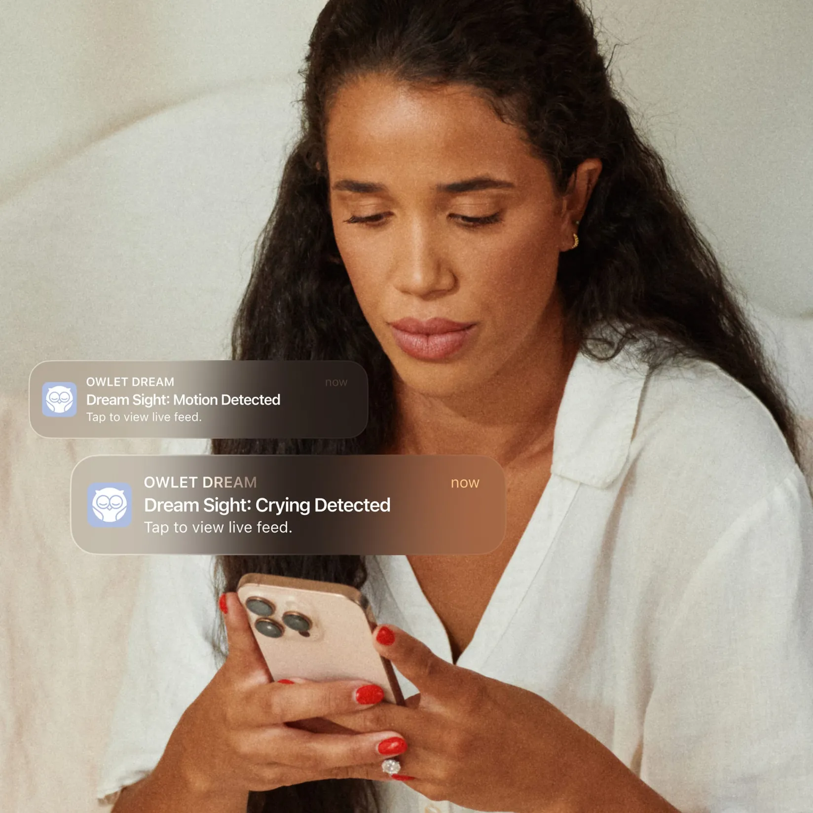Owlet Dream Sight™ is our most advanced video baby monitor—designed to help you stay connected, informed, and confident from night one. It streams crisp 2K HD video with night vision for around-the-clock visibility and detects motion, sound, and crying to automatically save video clips in the Owlet Dream App and alert you in real time. Two-way talk lets you soothe your little one from anywhere, and built-in temperature and humidity tracking helps maintain a safe, comfortable sleep environment. Dream Sight integrates seamlessly with Dream Sock® for a complete experience.