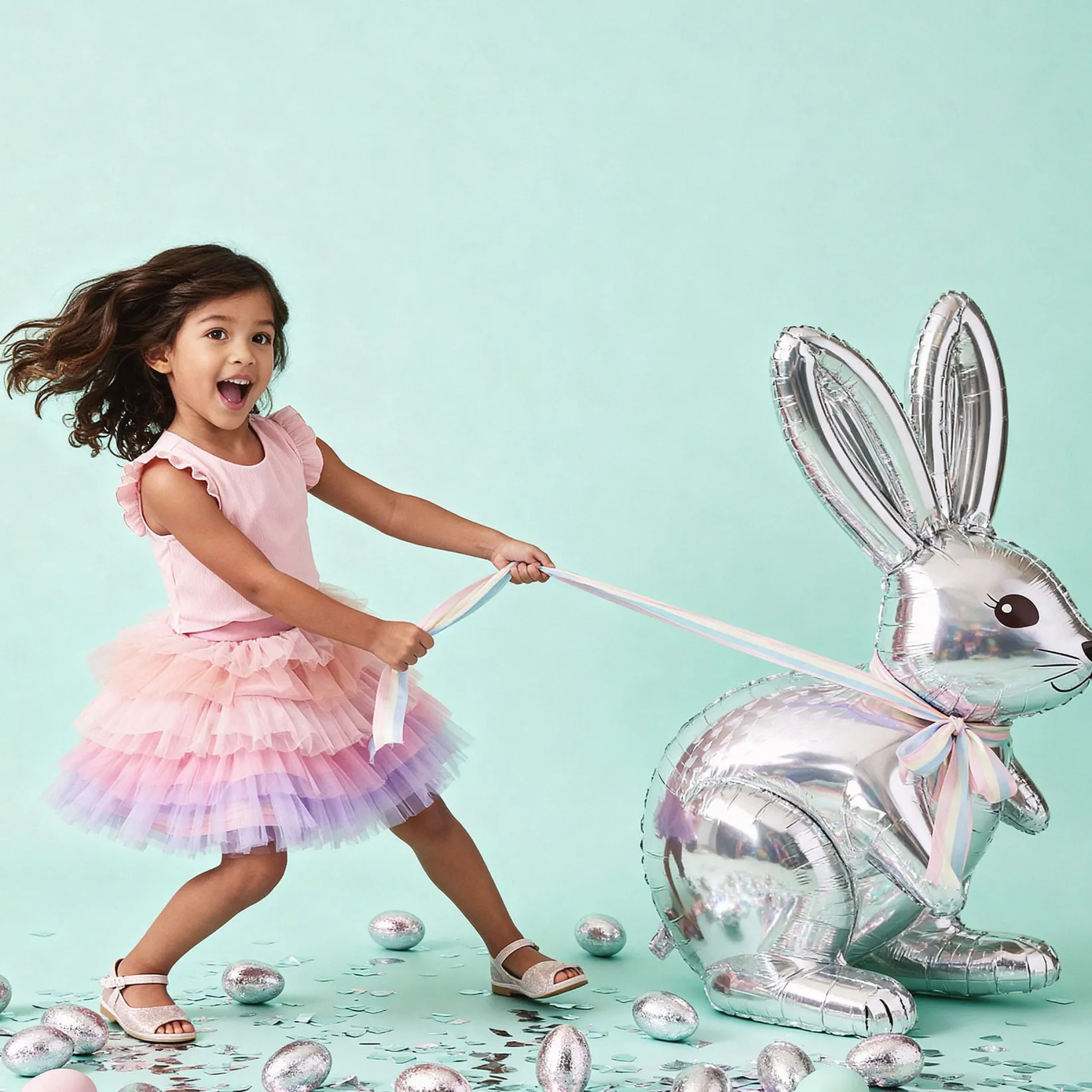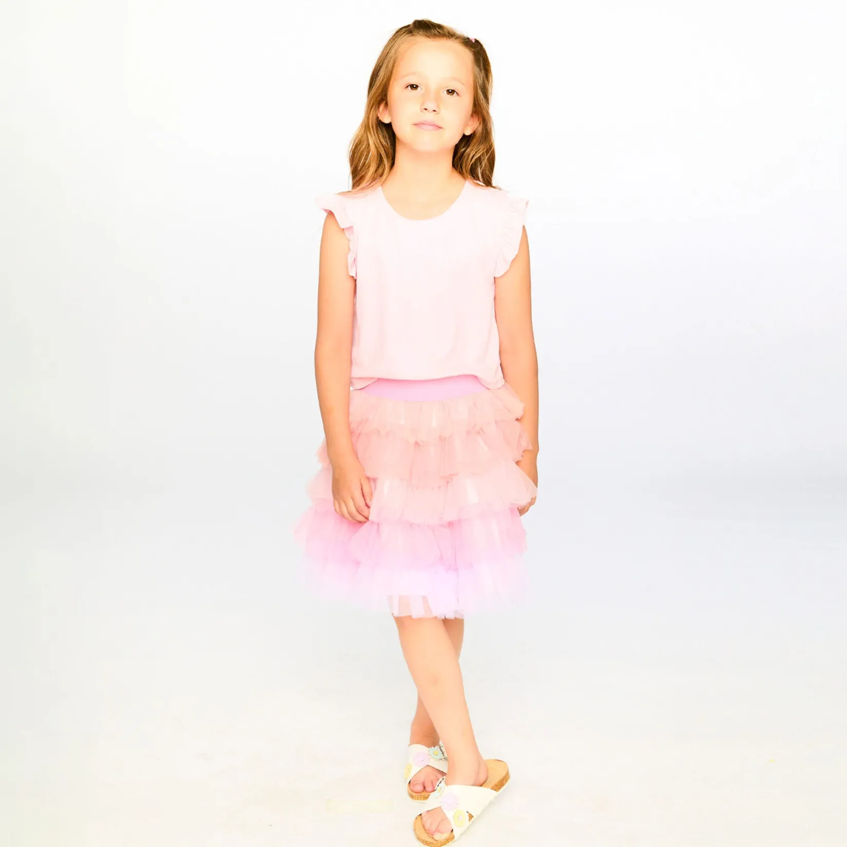 This bi-material dress in pale pink is both playful and elegant. The soft fitted bodice features delicate flutter sleeves, while the skirt steals the show with cascading ruffled tiers in sheer layered mesh fabric. A comfortable lining ensures ease of movement, making it perfect for special celebrations.