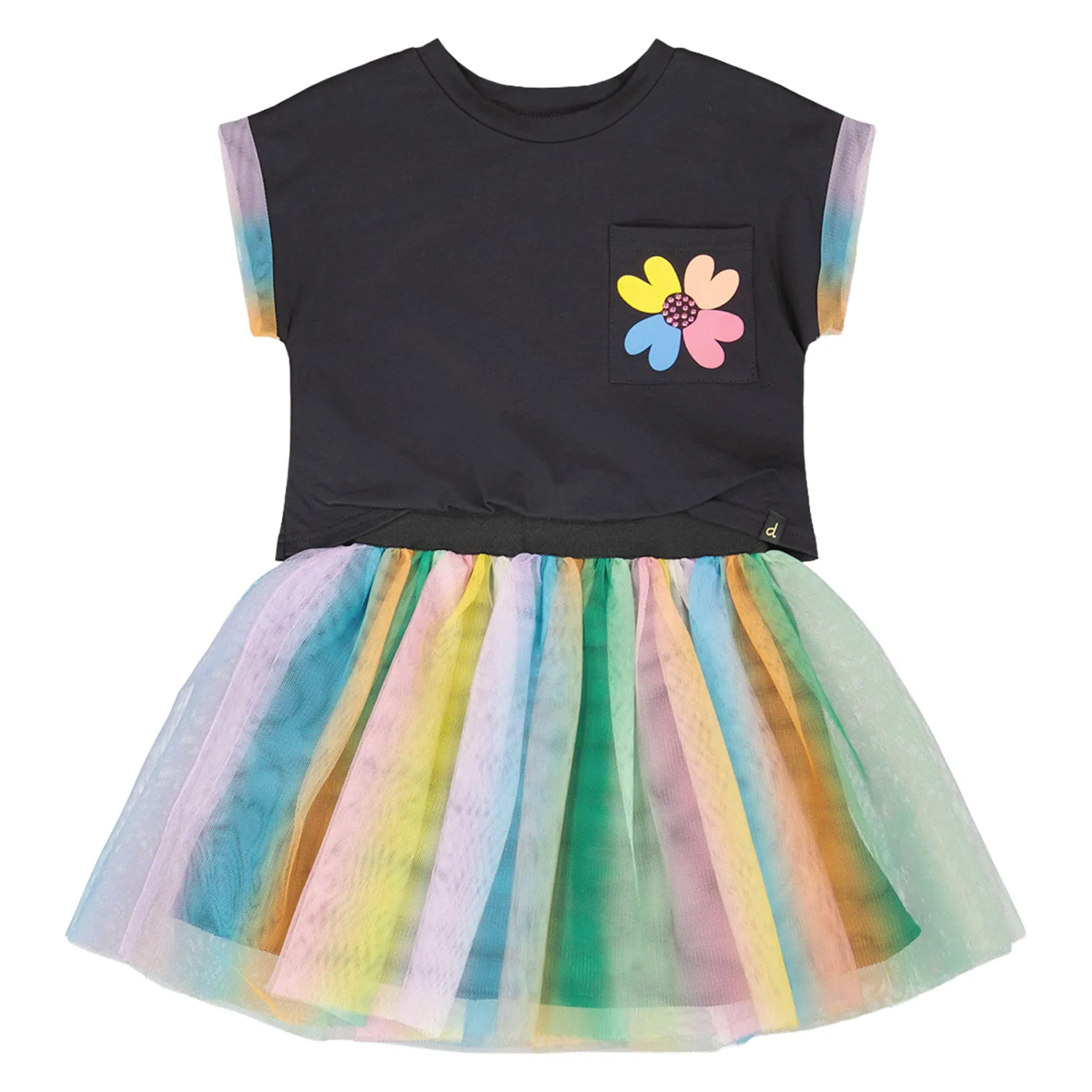 The bi-material dress in black brings a fun twist to everyday wear with its playful mix of textures. This short-sleeve dress combines a soft organic cotton jersey top with a rainbow-hued mesh skirt and features a round neckline, rainbow-colored sleeve borders and a small flower detail on the chest pocket. Made from a blend of breathable organic cotton with a polyester mesh skirt and lining, it ensures comfort and flair for every adventure.Sizes 2 and 3 years are designed without detachable 3D embellishments to ensure young children’s safety.