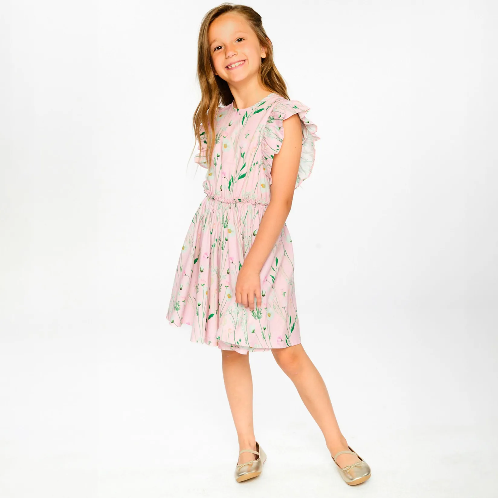 The viscose dress pink with printed flowers is light, playful, and full of charm. This sleeveless dress features delicate ruffles along the shoulders, an elastic waist with ruffles for comfort, and a flared skirt that twirls beautifully. Made from soft viscose with a cotton lining, it feels gentle against the skin and perfect for sunny days.