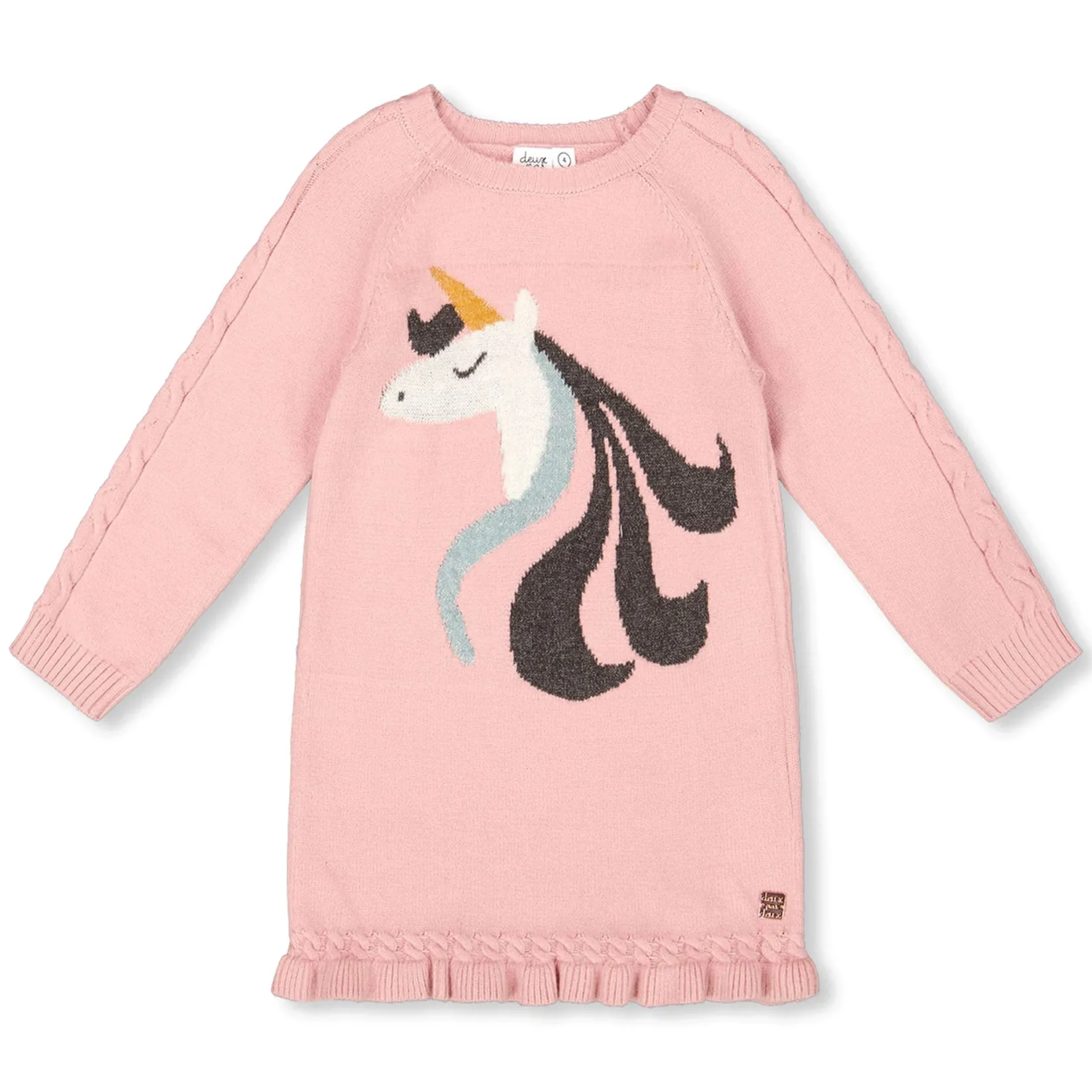 The Knitted Dress in Dusty Pink With Unicorn Intarsia brings charm and softness to any fall wardrobe. Made from a cozy knit blend, this sweater dress features long raglan sleeves in a textured knit, a large jacquard unicorn with glittery details on the chest, ribbed trims, and delicate ruffles at the bottom hem for extra flair. Its easy pull-on fit makes this dress perfect for school days, weekend fun, and everything in between.