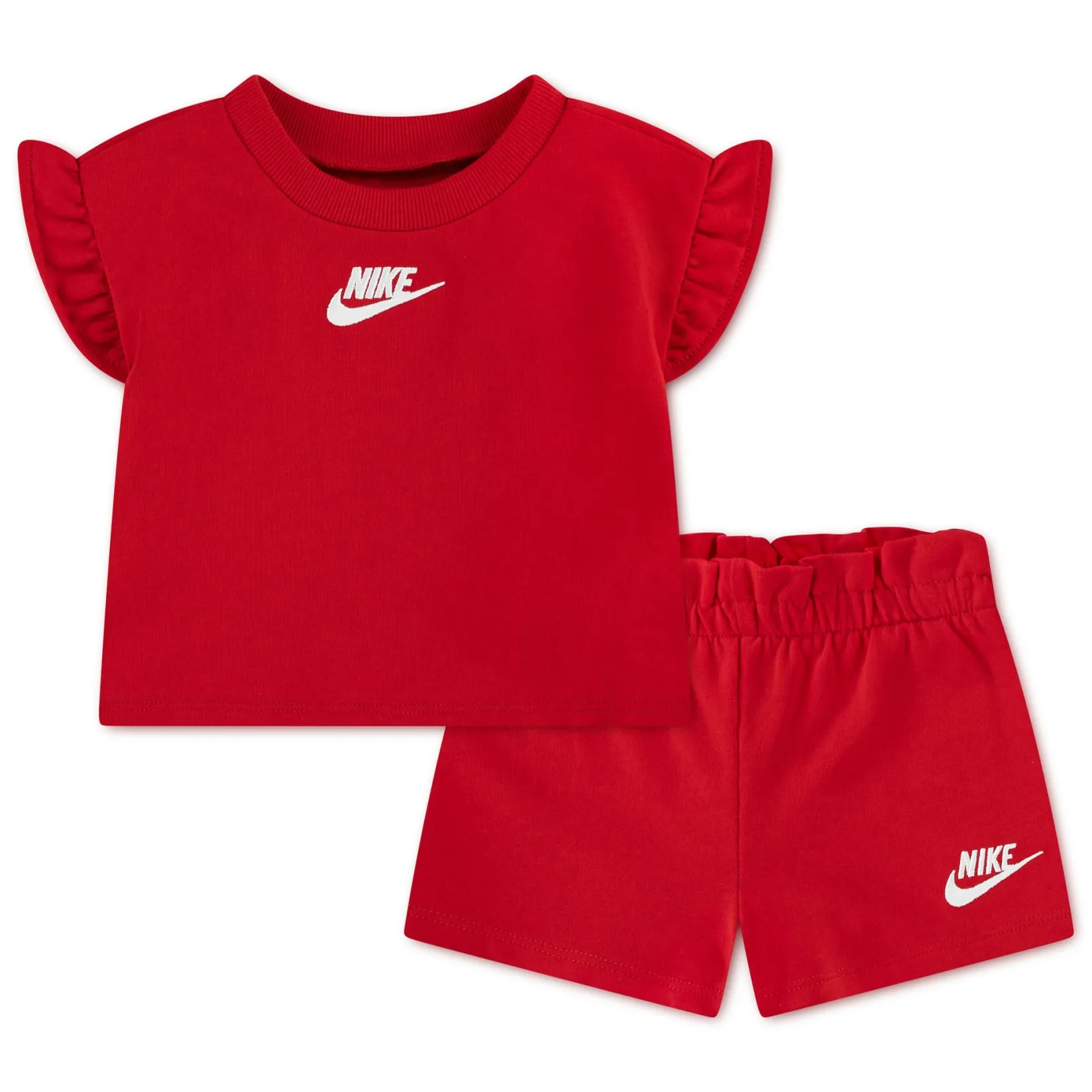 Made of lightweight, soft baby French terry, this 2-piece set from Nike is warm weather cozy. The top has a relaxed fit, tagless crewneck, and a boxy cut that creates a cropped look. The shorts have a comfy, stretch paper bag waist for a unique, laid-back look little ones can play freely in.