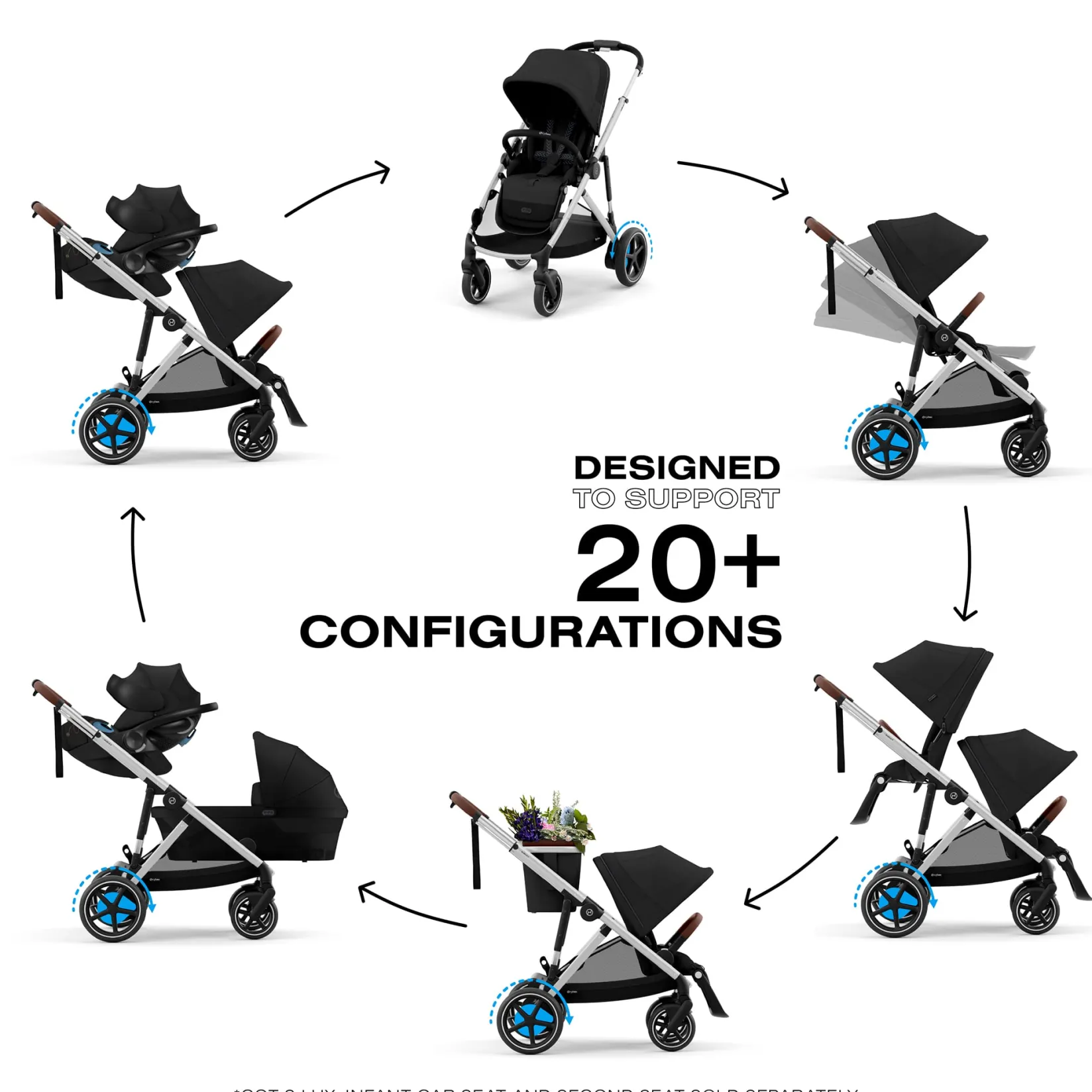20+ CONFIGURATIONS: Add a second Gazelle S Seat unit, Gazelle S Cot, or any CYBEX Infant Car Seat to meet your needs. (sold separately)