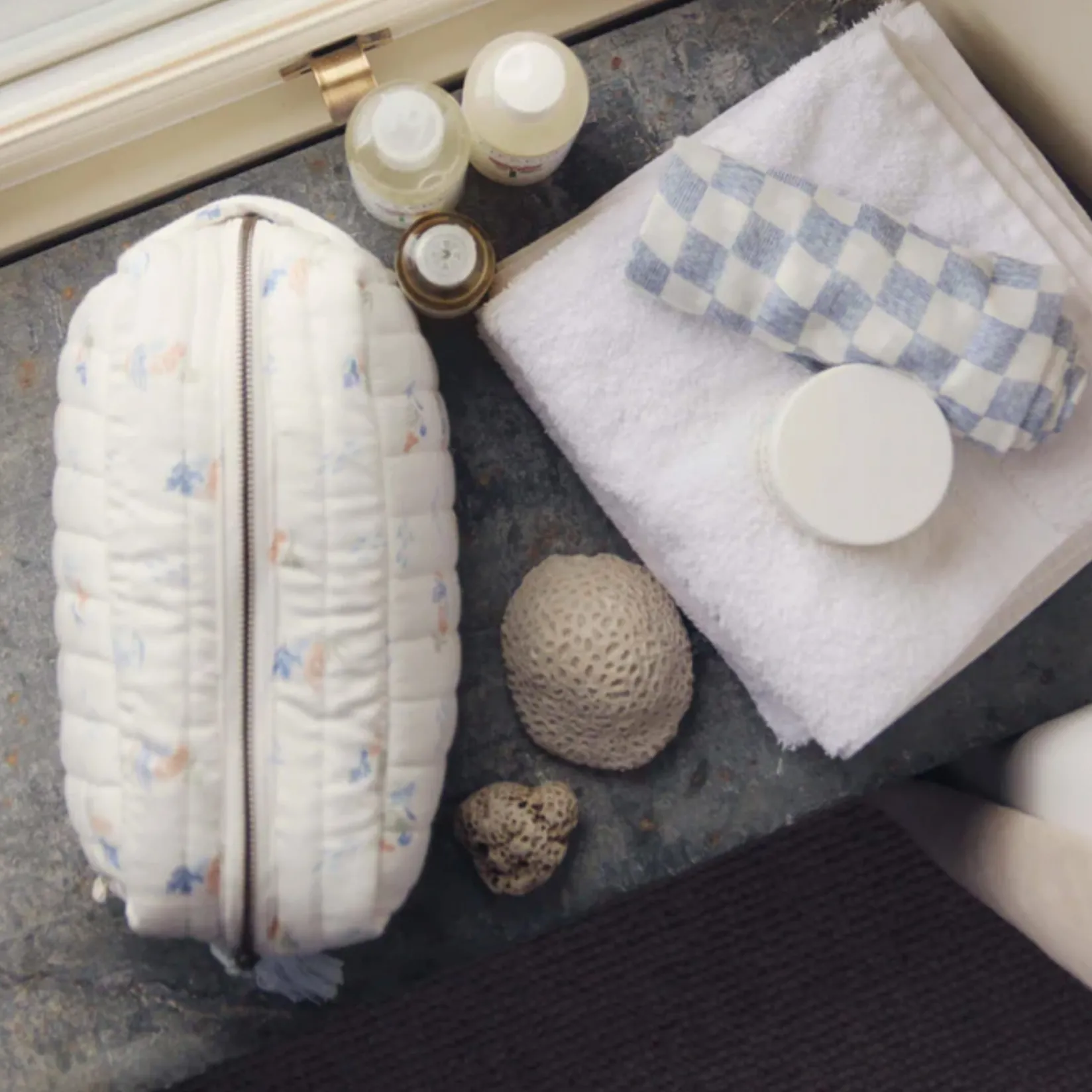The organic quilted wash bag comes in the unique prints with a stylish tassel. A beautifully designed, practical pouch for parent or baby to store ythe toiletries, make up, and more or nappies and creams. It also has a handy elasticised pocket inside. The product that is for parent and baby and has an infinite number of uses.
