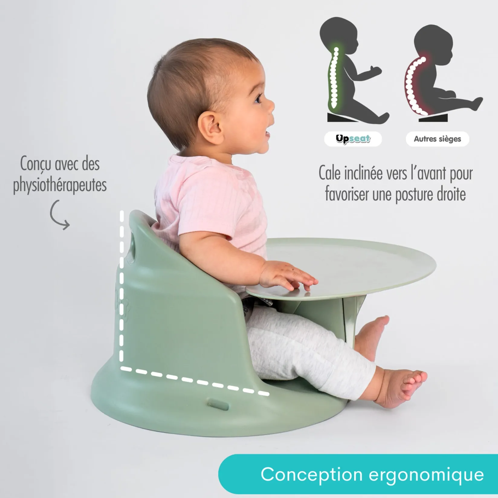 The Upseat was developed with the help of physiotherapists. Its ergonomic design promotes anterior pelvic tilt: a slight forward rotation of the pelvis that engages the muscles responsible for a proper upright posture. The Upseat is also designed to gently spread baby’s legs, encouraging healthy hip development.