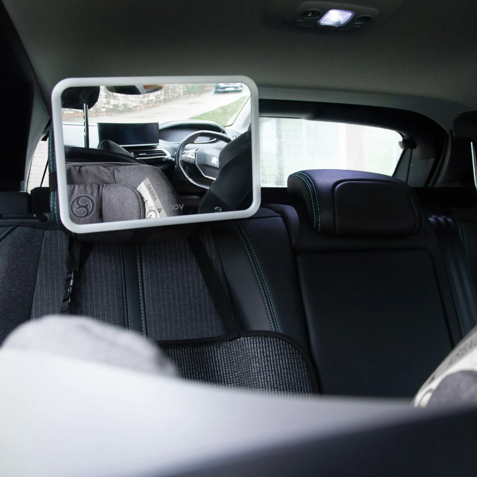 The Baby Car Mirror with LED is an extra-large rearview mirror designed to enhance safety and comfort during your trips, allowing you to easily monitor your child in the back seat.